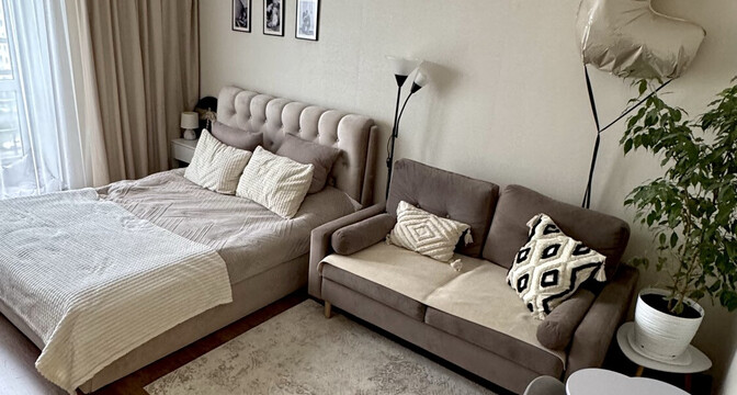 Еще одно предложение — однокомнатная квартира, расположенная на девятом этаже. Общая площадь однушки составляет 40 квадратных метров. Квартира состоит из прихожей с встроенным шкафом, отдельной кухни и жилой комнаты, совмещающей функции гостиной и спальни.
