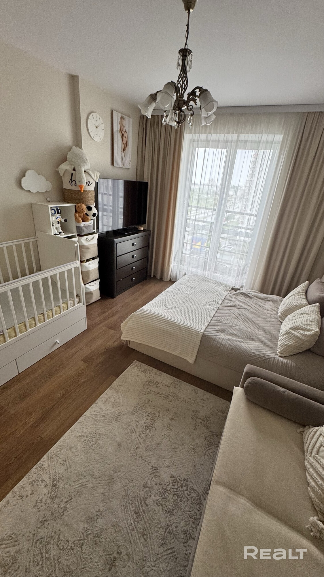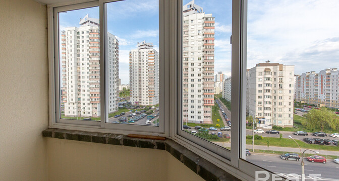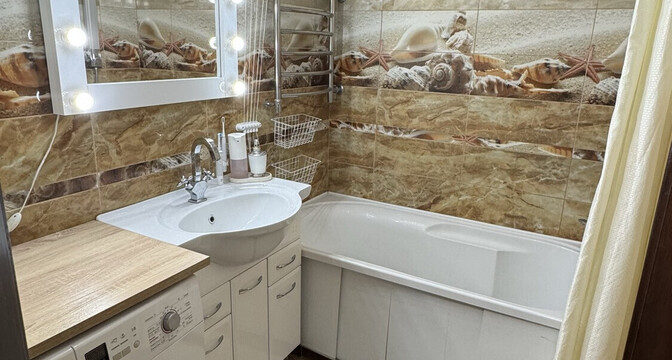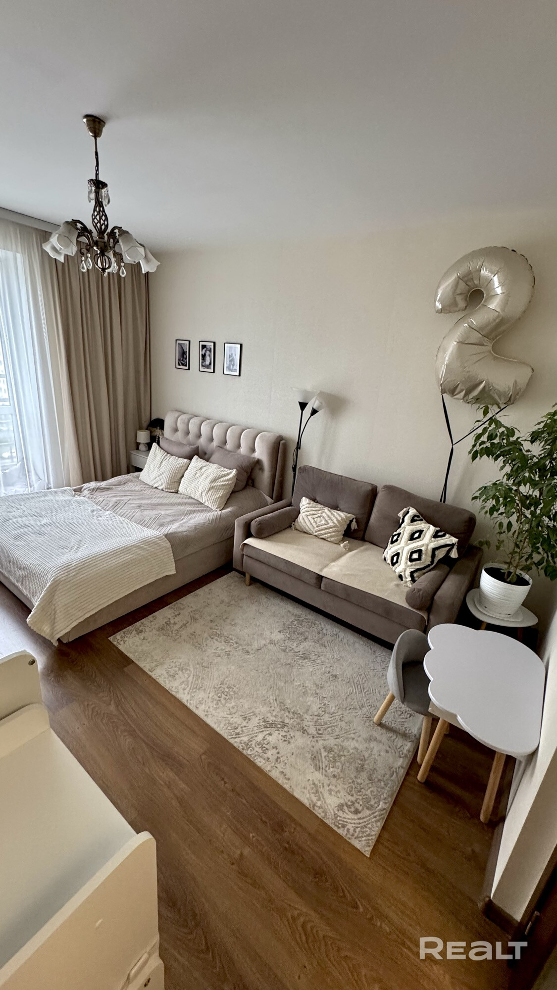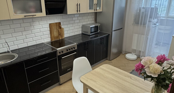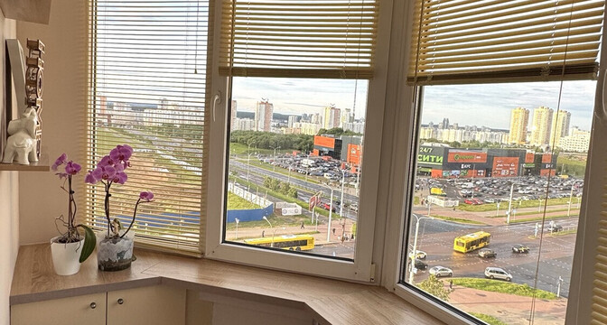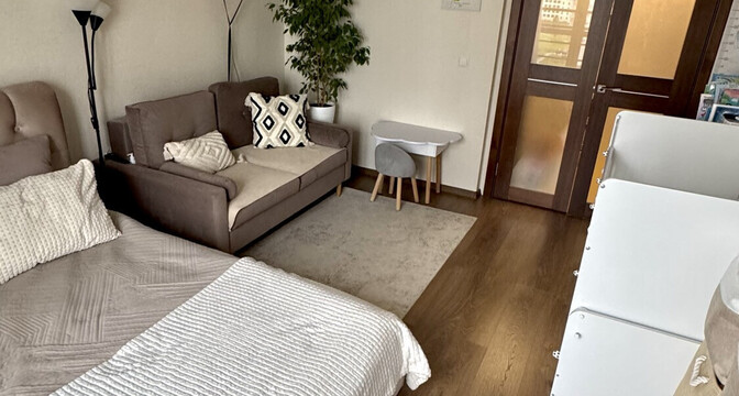 В однушке уже сделан качественный ремонт (плитка, обои, ламинат), квартира полностью готово к проживанию. На лоджии, примыкающей к кухне, устроена зона отдыха с видом на город. Стоимость квартиры — 89,9 тысячи долларов (2228 долларов — за метр).