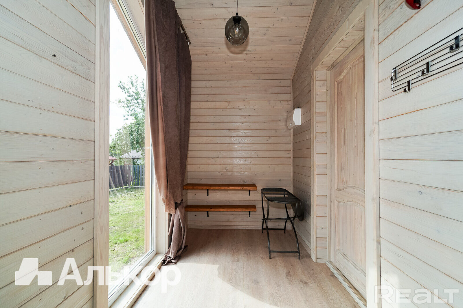 Общая площадь барнхауса составляет 40 квадратных метров. Дача состоит из прихожей, кухни-гостиной, спальни и санузла. Внутренняя отделка дома выполнена из экологически чистого материала.