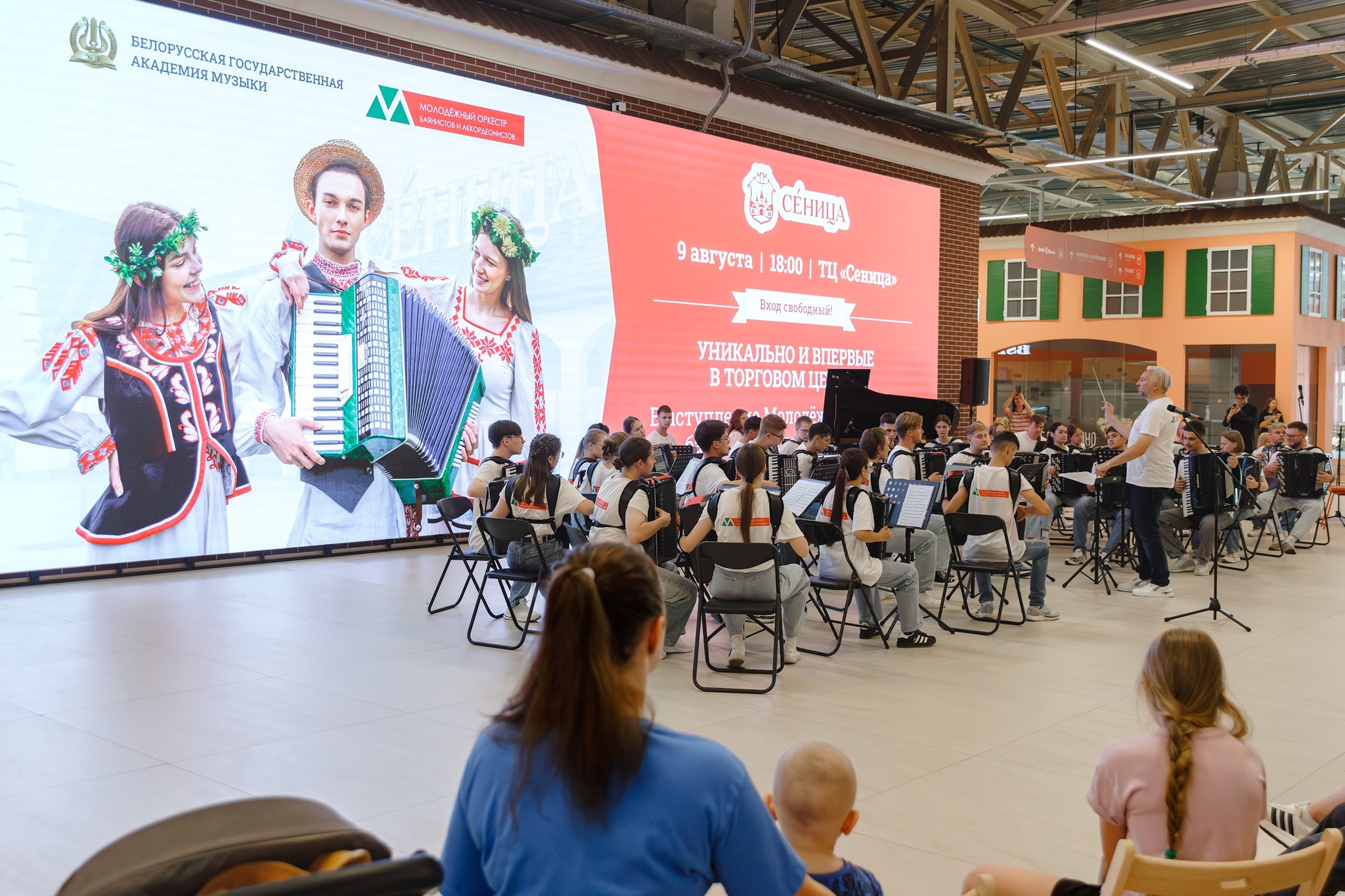 Иногда программу развлечений делают еще более разнообразной. Так в один из вечеров августа каждый желающий смог услышать избранные произведения Вивальди, Чайковского, а также современных композиторов в исполнении молодых музыкантов. Перед слушателями, которые собрались в торговом центре, выступали участники Молодежного оркестра баянистов и аккордеонистов Республики Беларусь, созданного в честь 80-летия Великой Победы. Новый коллектив объединил талантливых студентов и учащихся со всей Беларуси.