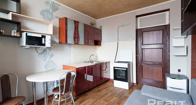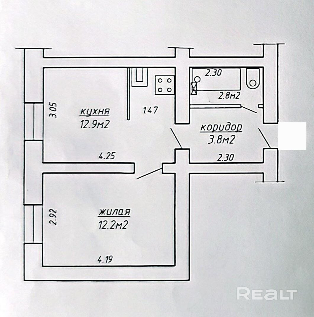 Общая площадь квартиры — 32 квадрата — 12 метров приходится на жилую комнату и 13 на кухню.