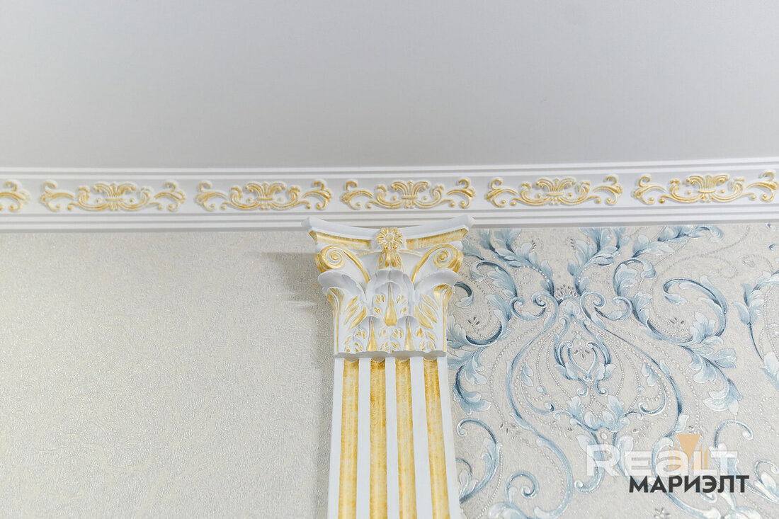 Атмосферу высокой роскоши в трешке поддерживает фактурная штукатурка, венецианская лепнина, светильники и люстры из Чехии, а также потолочные плинтусы с имитацией резьбы и элементами позолоты.