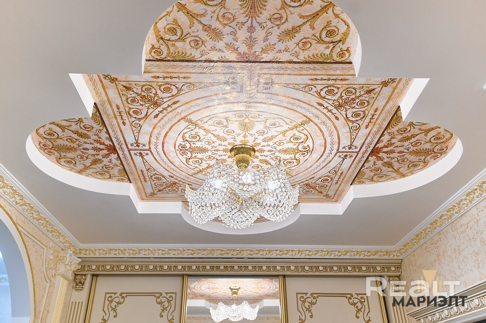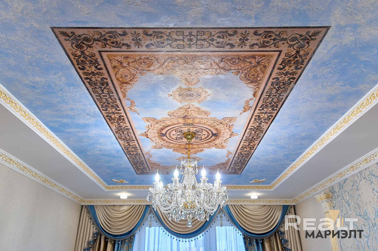 Ну, а особое внимание гостей, конечно, привлекает эксклюзивная фреска на потолке в гостиной и коридоре.