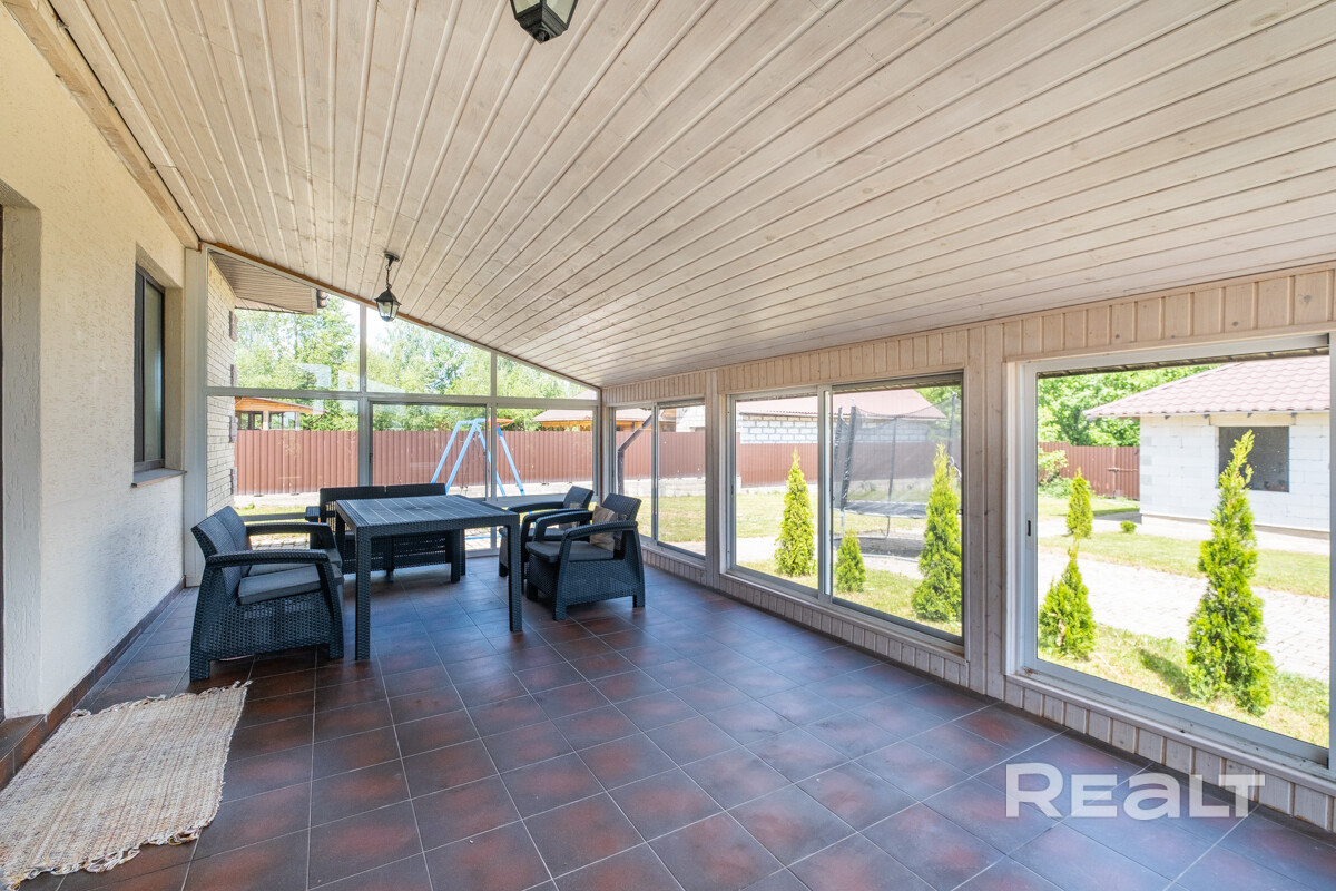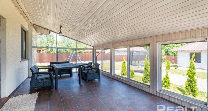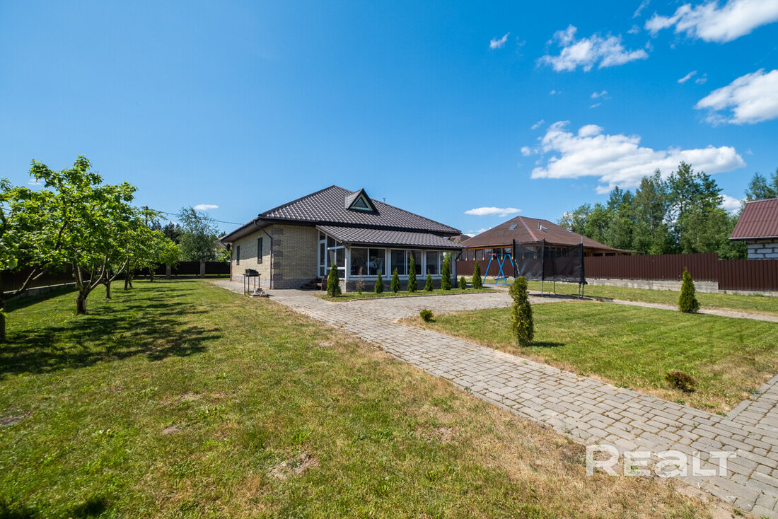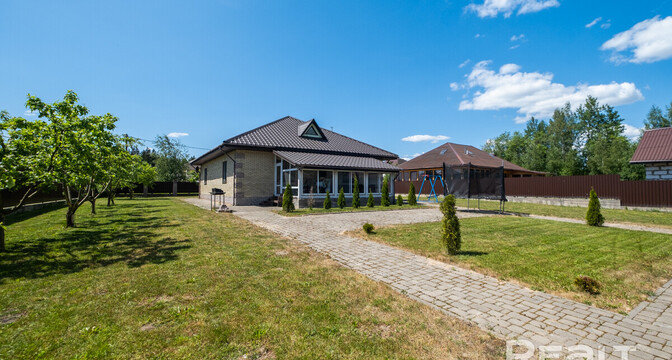 Построен в 2013 году из блоков, фасад отделан декоративным кирпичом, на крыше — черепица. Общая площадь — 211 квадратов. На первом этаже находятся гостиная-кухня, прихожая, санузел, топочная, две жилые комнаты. На мансарде — две спальни, гардеробная, санузел. Снаружи к дому пристроена застекленная терраса.