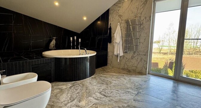 В основной доме на 209 квадратов уложен паркет, санузлы готовы (закуплена дорогая импортная сантехника). Все коммуникации введены: газ, вода, канализация, электричество. Стоит же этот комплекс — 555 999 долларов. Недешево.