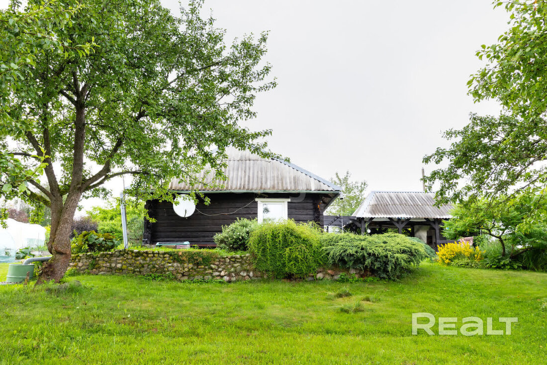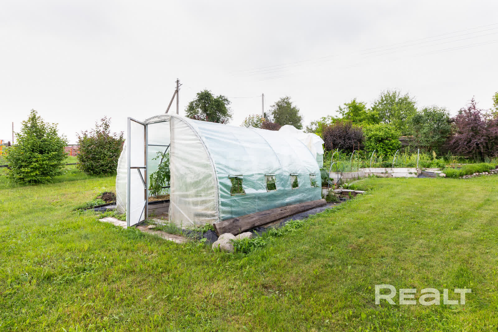 Помимо дома, на участке 25 соток также имеется сарай. Территория разбита на зоны: огород с высокими бетонными грядками и парником, декоративный сад, большой сад с яблонями, грушами, алычей, сливами, вишней, иргой, 6 кустами лещины (орешник), молодыми посадками сортовых кустов голубики, черной и красной смородины, малины и грецкого ореха.