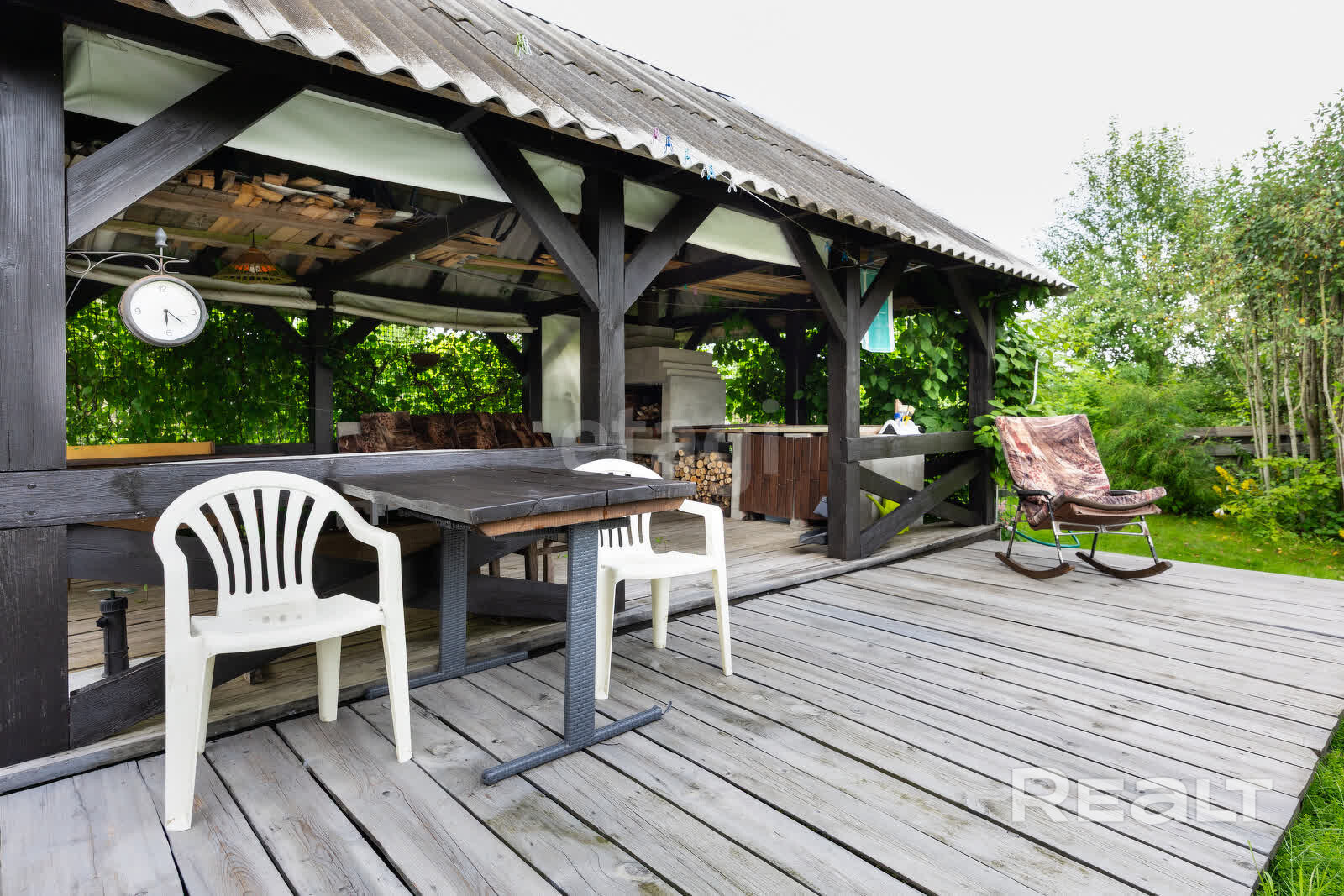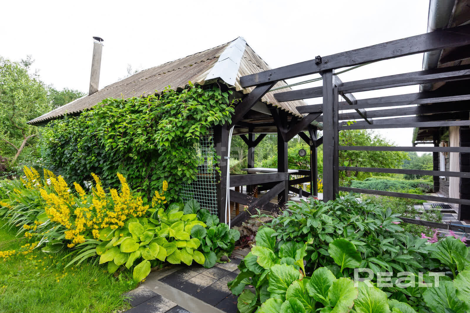 Пергола и шпалера соединяют дом с большой беседкой (24 м2), оборудованной кирпичным барбекю и мойкой (с холодной и горячей водой), а также открытой террасой (15 м2).