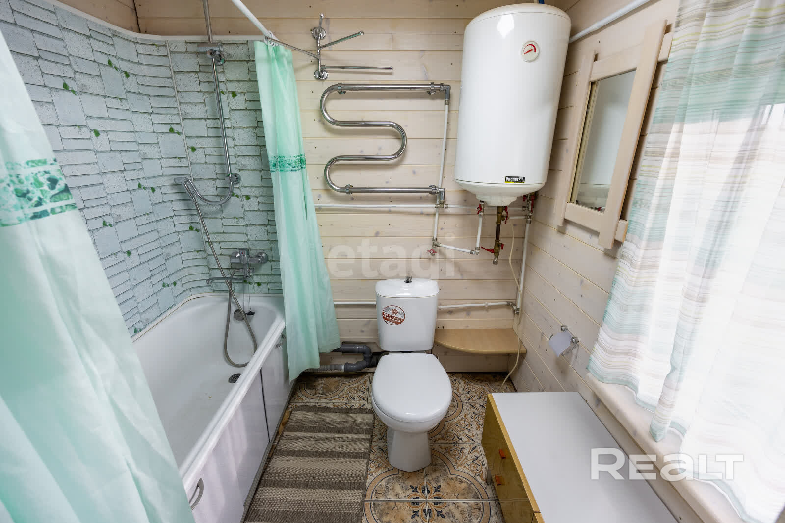 В санузле находим ванну и унитаз. Вода нагревается в электробойлере. Водопровод центральный, канализация местная.