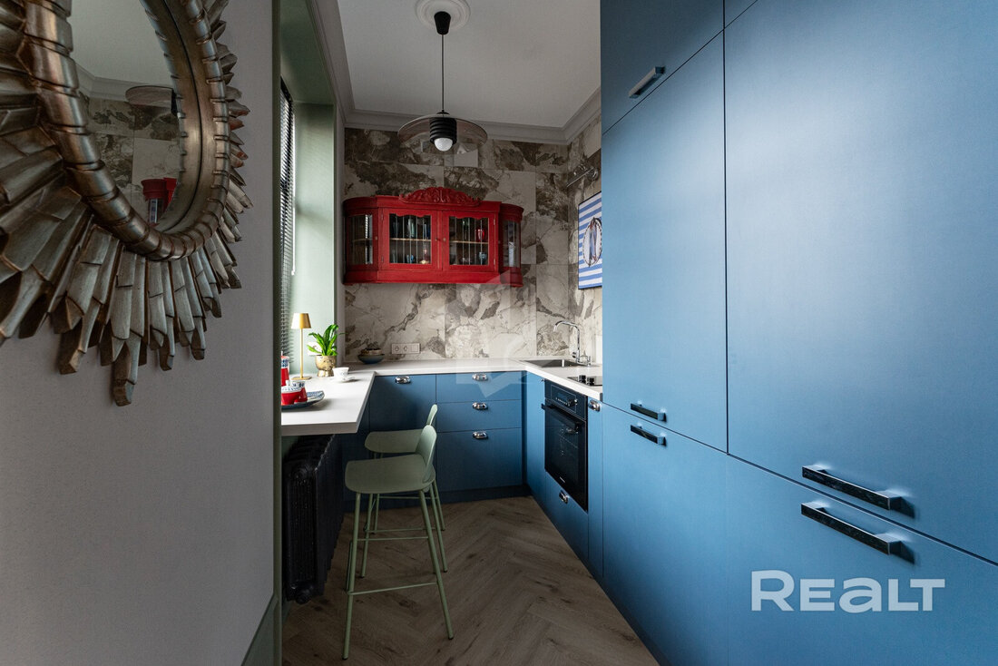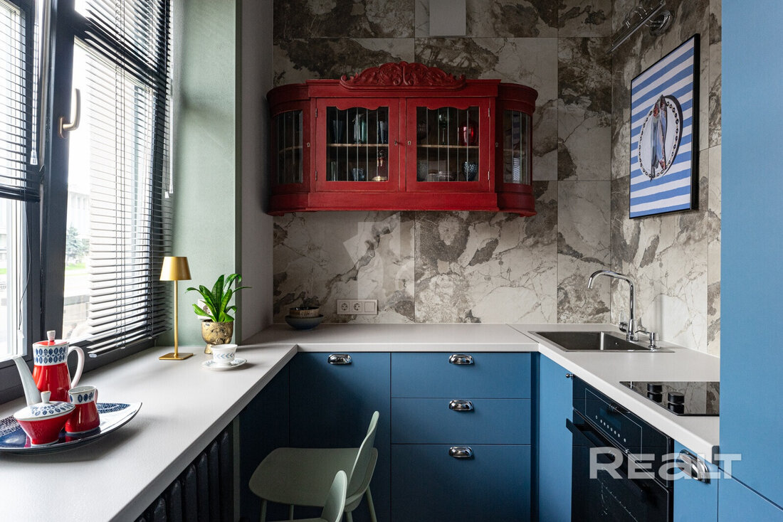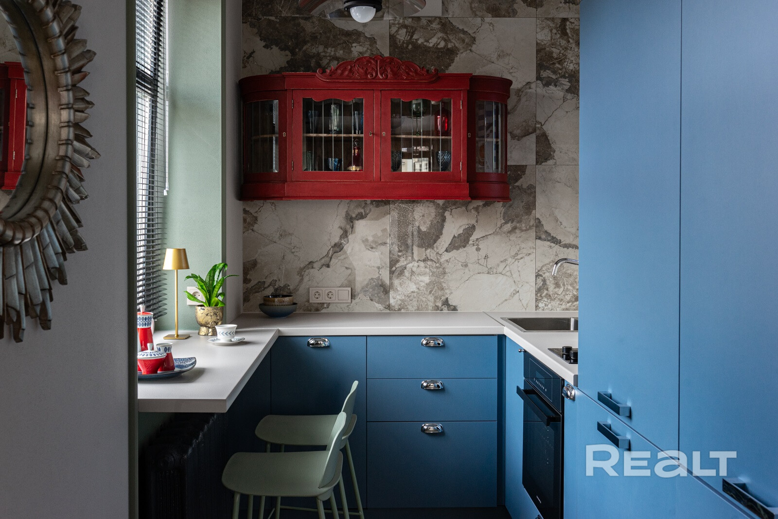 Кухонные фасады выполнены в голубом цвете, который гармонично контрастирует с ярко-красным винтажным буфетом. Столешница переходит в подоконник, который выполнен в качестве барной стойки.