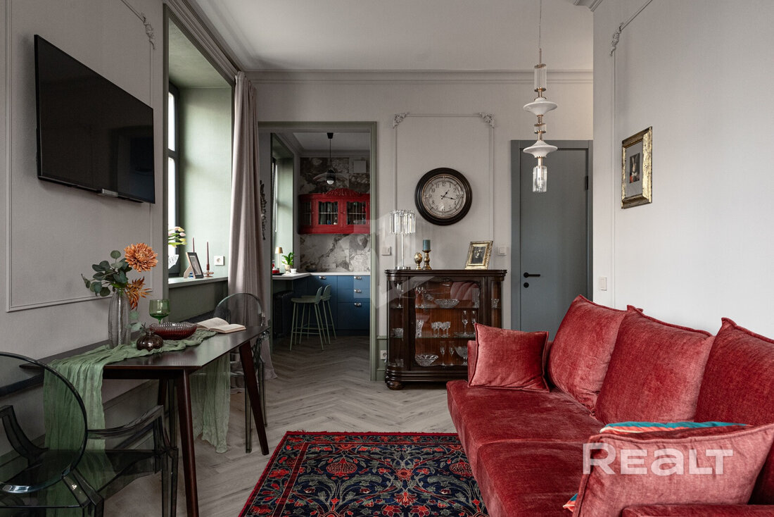 Обеденную группу — стол и стулья — поставили в гостиной. Это позволило сэкономить место в небольшой кухне. Еще в гостиной есть яркий диван, кресло с торшером и винтажный буфет. В комнате три окна, а стены оформлены молдингами.