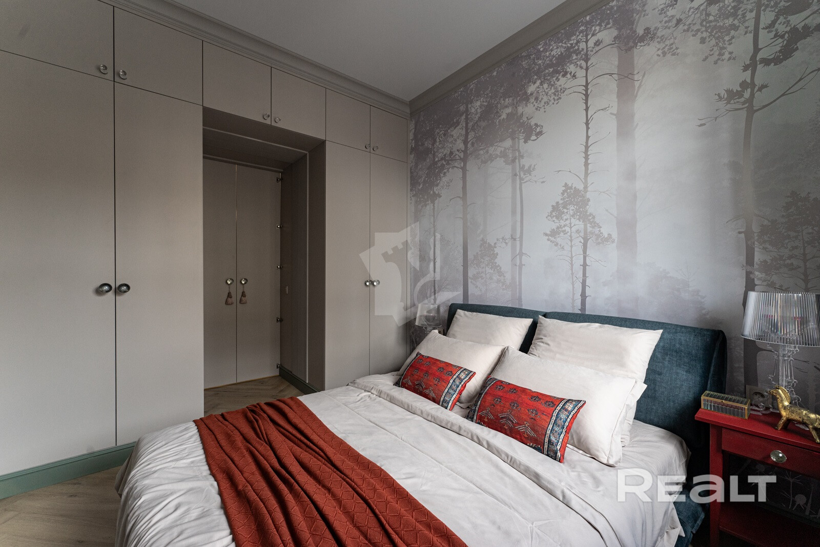 В спальне оборудованы лаконичные встроенные шкафы и стоит двуспальная кровать.