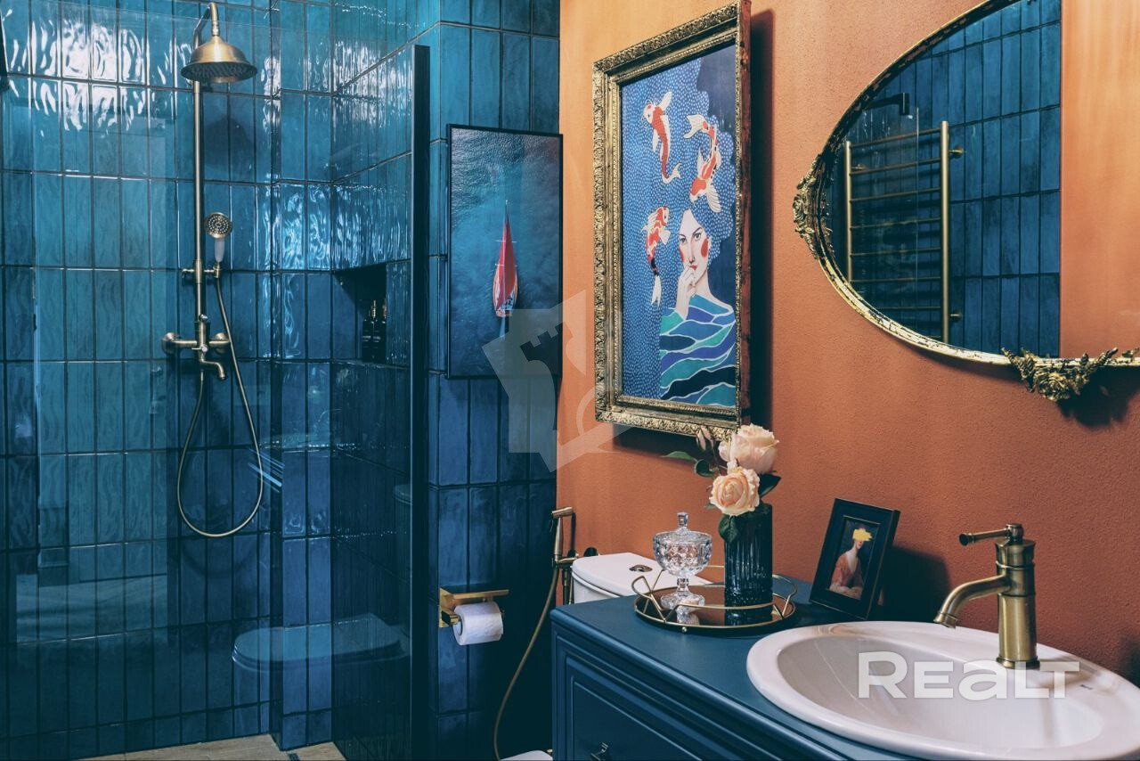 В тех же ярких контрастных цветах выполнен и санузел. Он в этой квартире совмещенный. Установлена душевая.