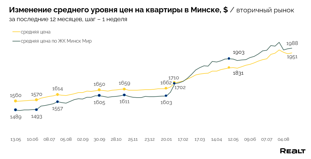 В результате, средняя стоимость кв. м. за последнюю неделю немного подросла. На данный момент цена за квадрат составила 1951 $. При этом стоимость квадрата на квартиры в Минск-Мире также увеличилась на 0.3% и составила уже 1988 $.
