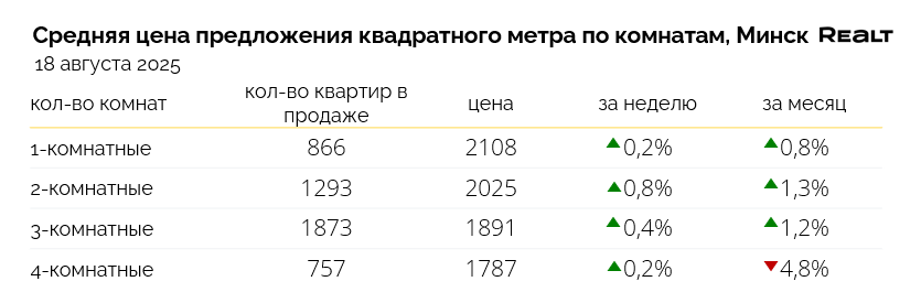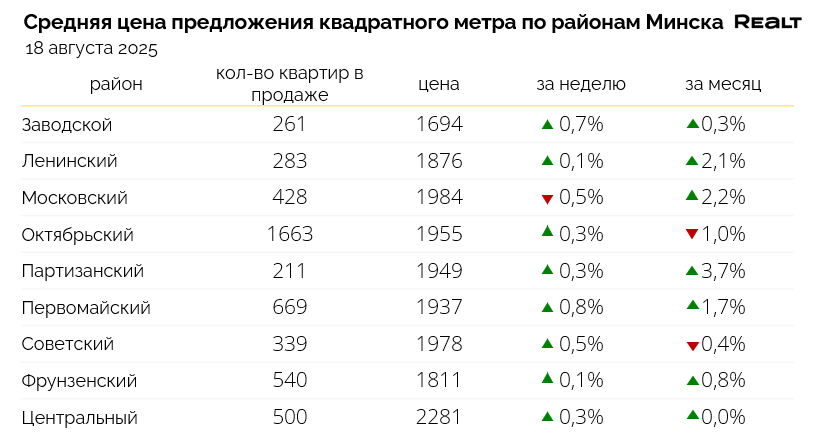 Брест — 1097 $/м2 (+0.1%), Витебск — 858 $/м2 (+0.6%), Гомель — 921 $/м2 (-1.2%), Гродно — 1000 $/м2 (+0.3%), Могилев — 970 $/м2 (+0.2%).