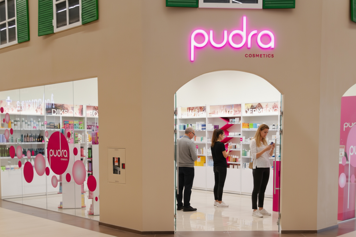 Наше импровизированное путешествие начинается в магазине косметики и парфюмерии Pudra. Его легко узнать по ярко-розовой вывеске. Внутри вас ждут уходовая косметика для тела и лица, декоративная косметика, аксессуары.