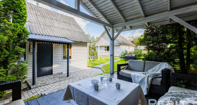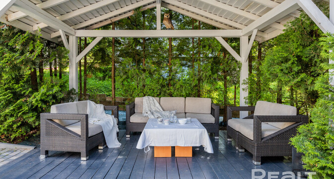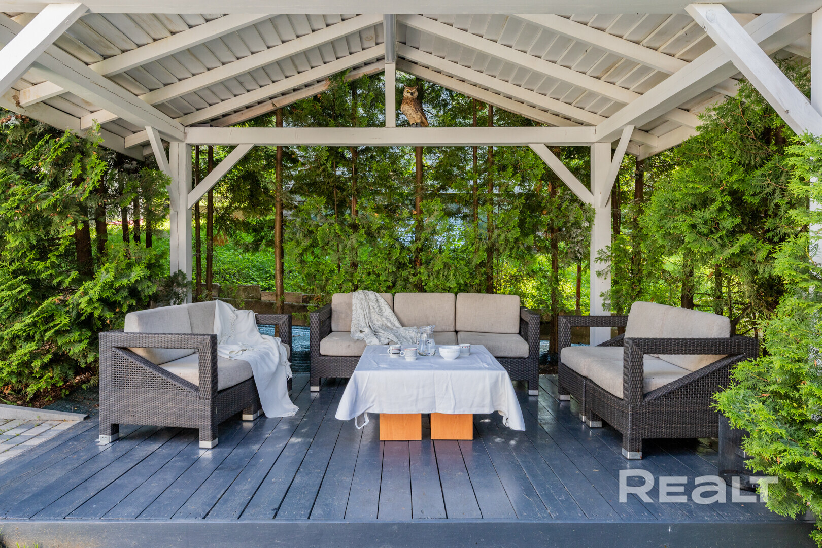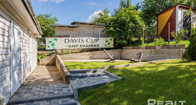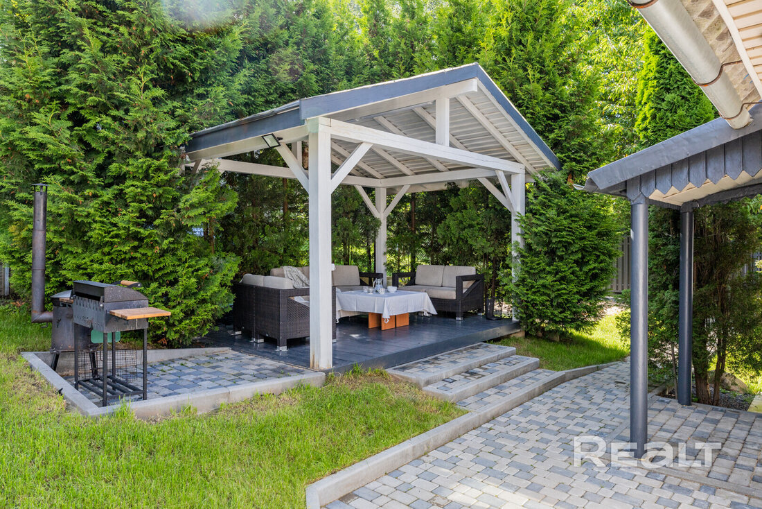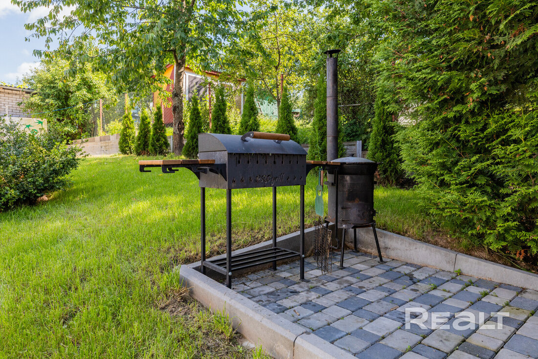 Обустроены на участке несколько зон отдыха, в том числе беседка с итальянской мебелью из ротанга. На зеленых зонах растут яблони и груши. Территория по периметру огорожена сеткой-рабицей, а с лицевой стороны — металлопрофилем.