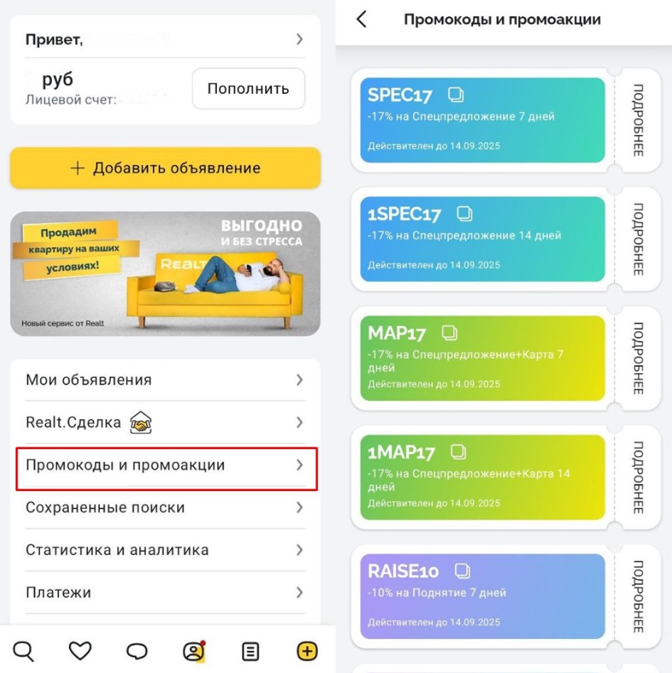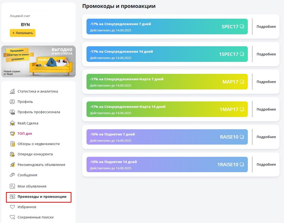 Промокоды от Realt — это по сути скидки на услуги продвижения объявлений. И к сентябрю мы дарим промокоды каждому пользователю!