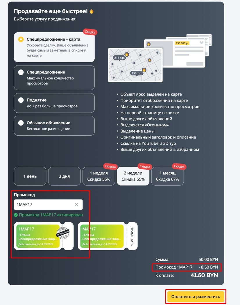 Все легко. Вы заходите на страницу оплаты продвижения вашего объявления, выбираете нужную услугу (например, спецпредложение + карта) — и нажимаете кнопку «Применить» на нужном промокоде.