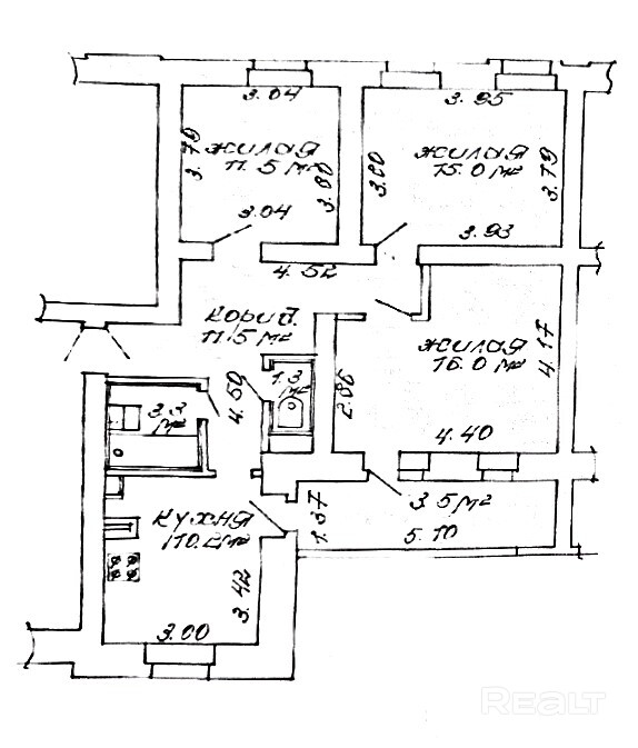 Из-за небольшого числа квартир жилье в продаже тут появляется нечасто. Но сейчас на Realt тут продают трешку на 68,8 квадрата на третьем этаже. У нее вот такая планировка: