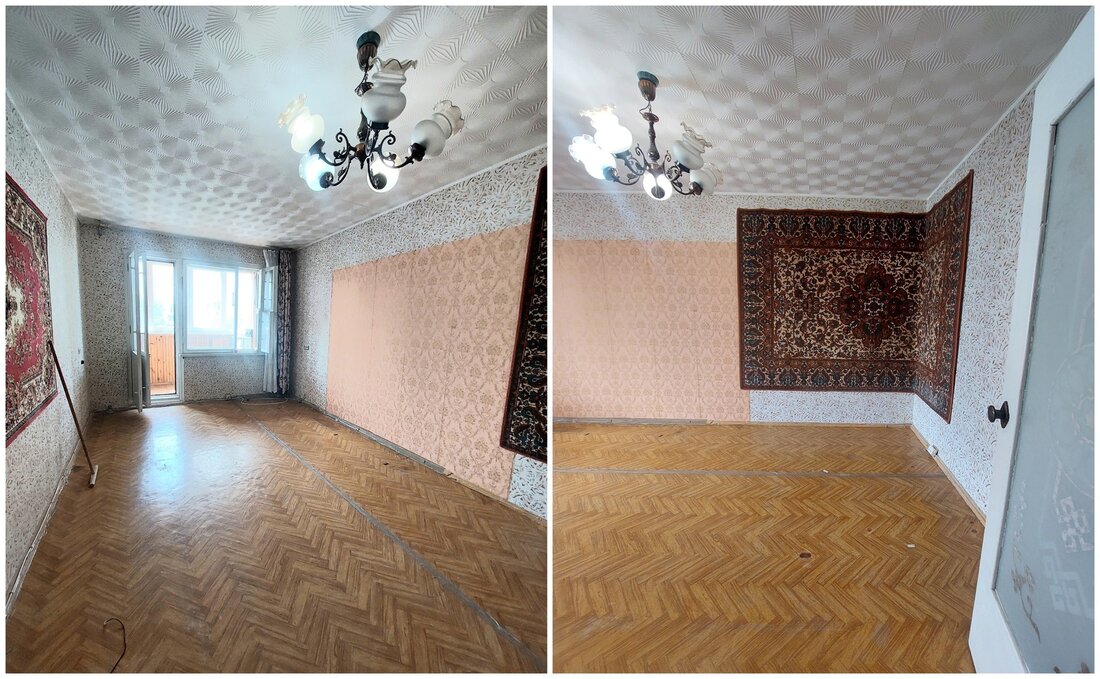 Квартира нуждается в обновлении. Тут есть две ниши, в которых можно встроить шкафы. На полу в комнате лежит паркет. Из жилой части есть выход на застекленный балкон.