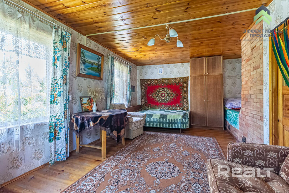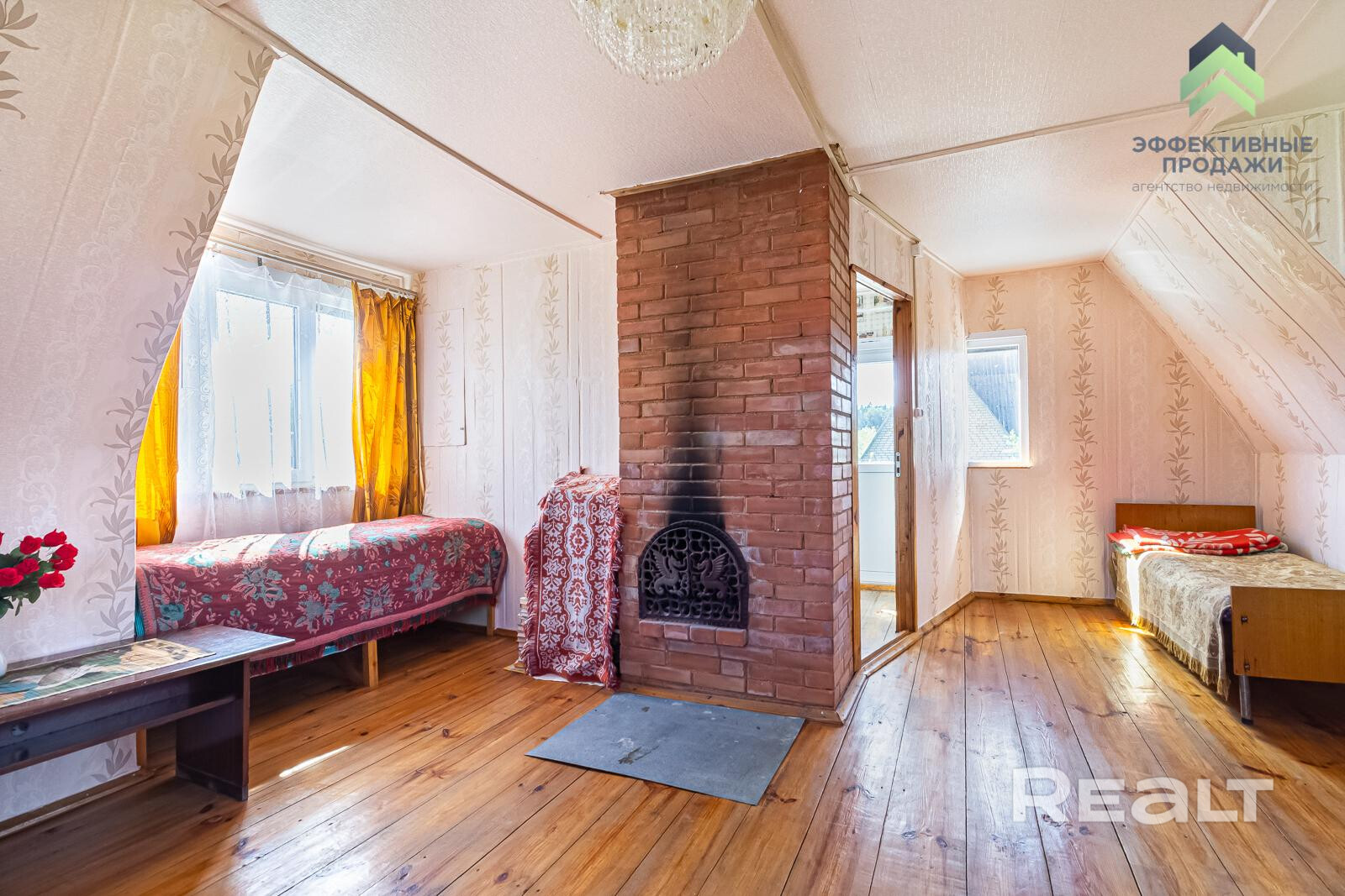 На втором этаже, куда ведет деревянная лестница, можно найти еще одну жилую комнату с камином. Внутри дома — уютное дачное ретро с коврами, советской мебелью и пузатым телевизором. Полы в доме — деревянные, а в окнах — современные стеклопакеты ПВХ.