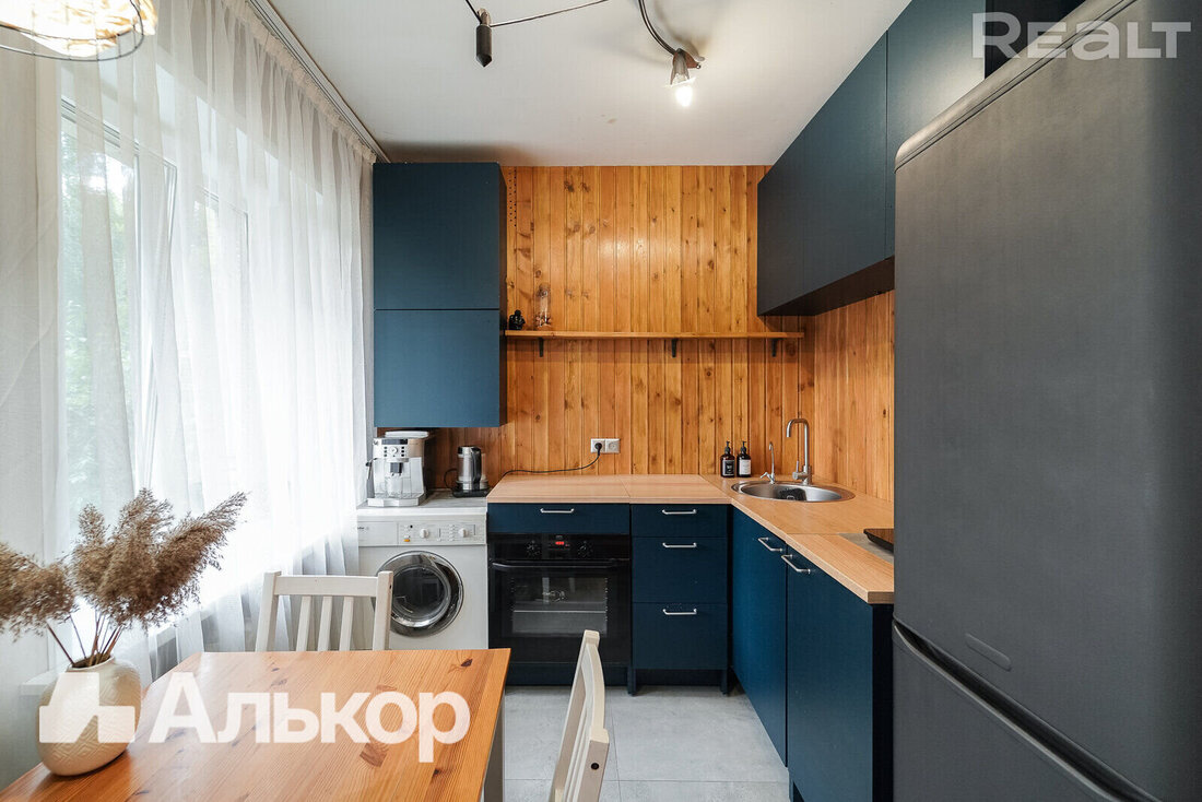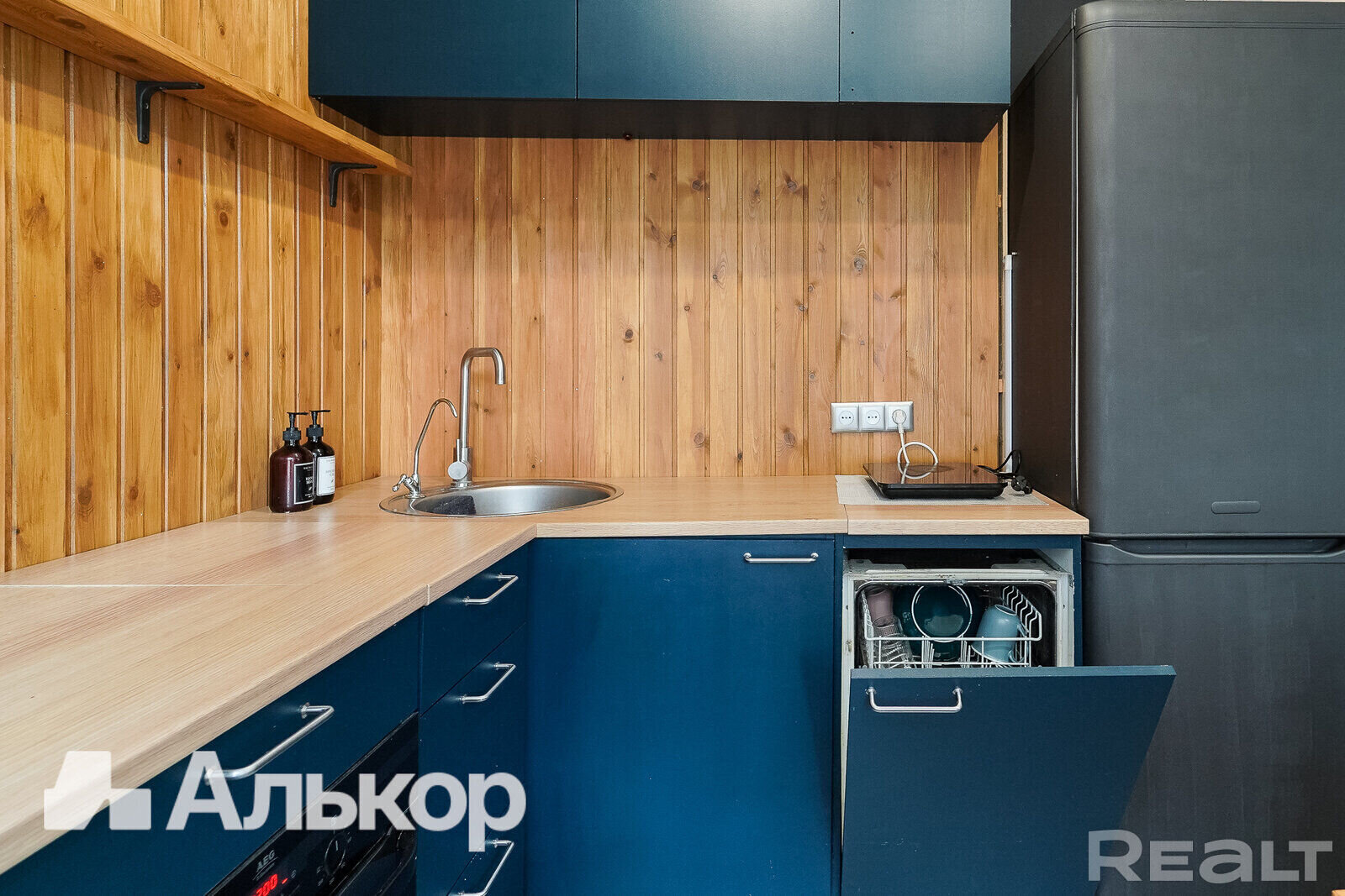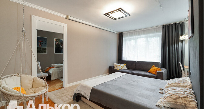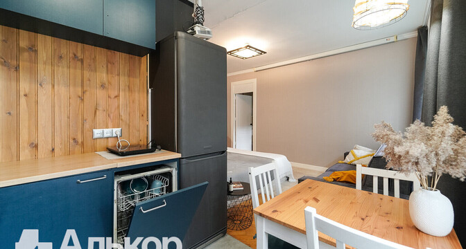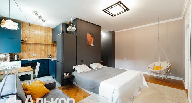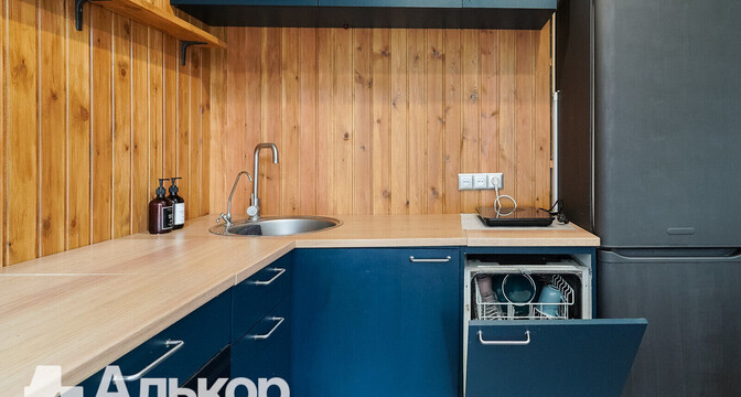 Нашли в продаже стильную двухкомнатную хрущевку, которую переделали под евроформат: объединили гостиную, кухню и часть коридора. Цвета в интерьере интересные: синий кухонный гарнитур, фартук из вагонки и черный матовый коридор. Жилье обустраивали под семью с ребенком, с двумя спальными местами. Посмотрите, как получилось. Кстати, квартиру можно купить в лизинг — консультация вот здесь.