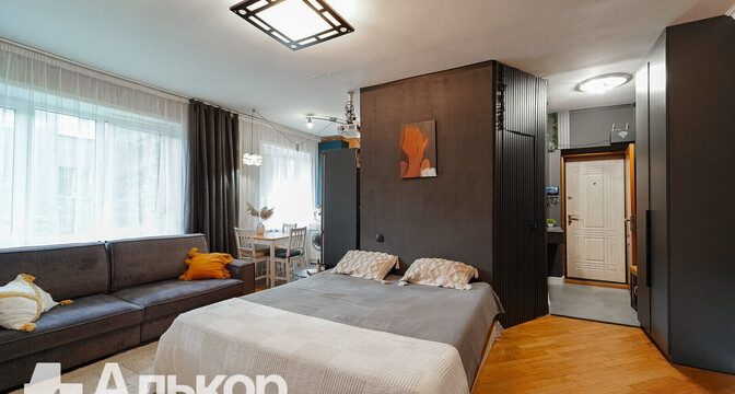 В квартире совмещены кухня и гостиная. Она с хорошим ремонтом: на полу в комнатах уложен паркет, в кухне и санузлах — плитка. Потолки здесь выровнены и покрашены. В окнах стоят стеклопакеты с тройным остеклением, установлены двери из шпона.
