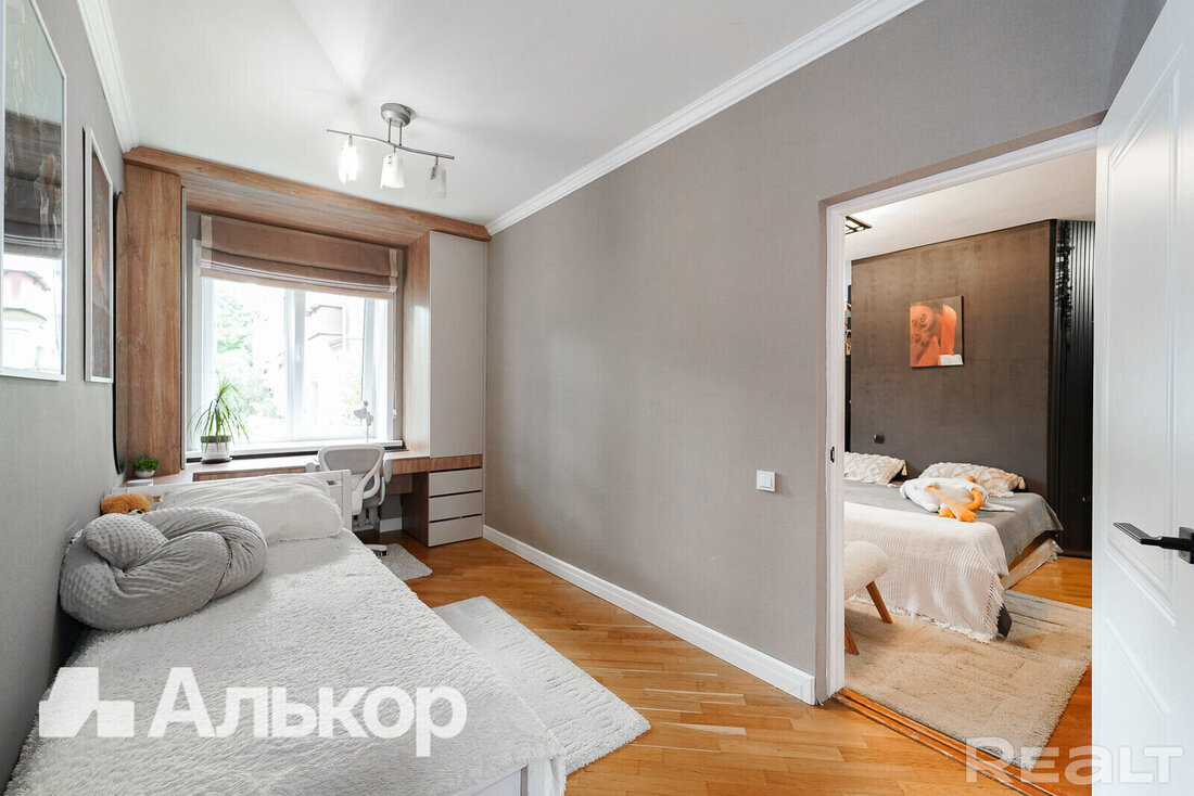 Во второй комнате обустроена детская. У окна — рабочий стол с полками и шкафчиками, напротив стоит вместительный шкаф.