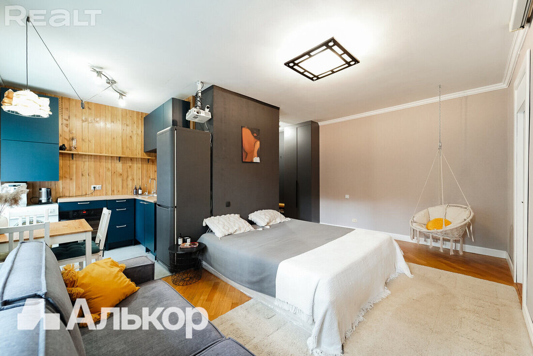 В жилой части у владельцев разместились большая кровать и диван. Из необычного — подвесное кресло в углу.