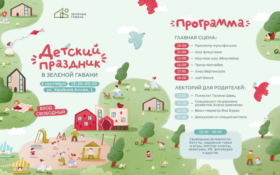 В Зеленой гавани 6 сентября развернется грандиозный семейный праздник с бесплатными активностями. Обещают уличные игры, творческие мастер-классы, лекции, концерты и другие развлечения, а для гостей будет работать большой фудкорт. До мероприятия доставит бесплатный трансфер от метро «Борисовский тракт».