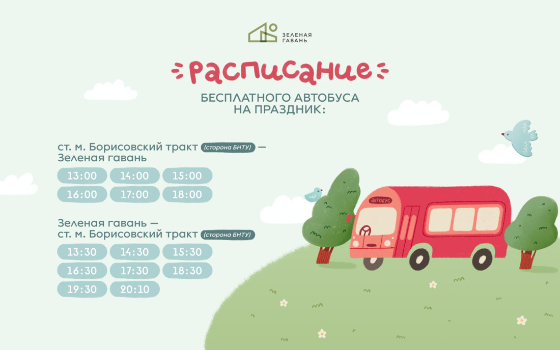 Из Минска будет ходить бесплатный трансфер до Зеленой гавани. Он будет отъезжать от станции метро «Борисовский тракт» каждый час с 13.00 до 18.00. Из Зеленой гавани микроавтобус будет уходить с 13.30 с периодичностью в час, а последними будут рейсы в 19.30 и 20.00.
