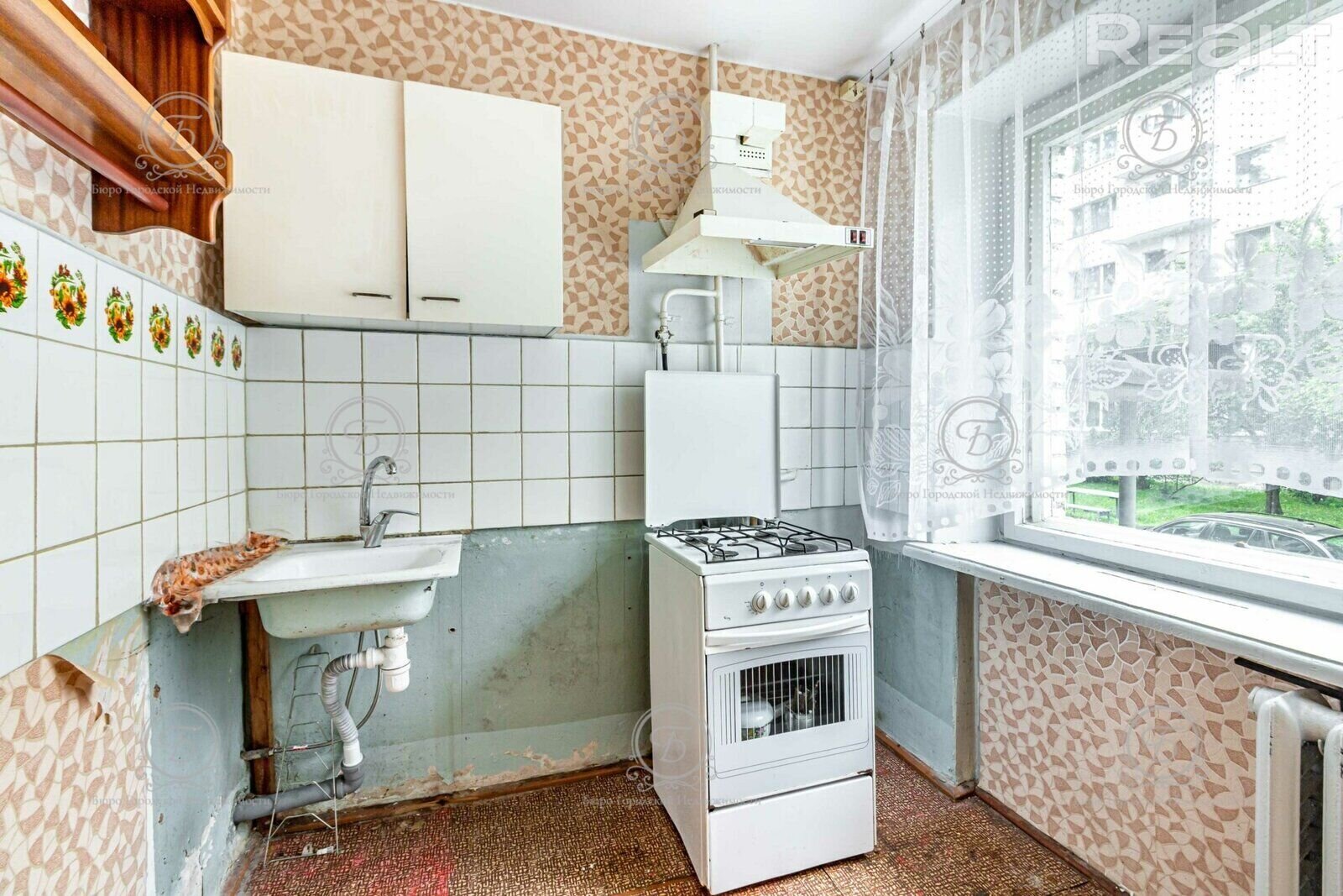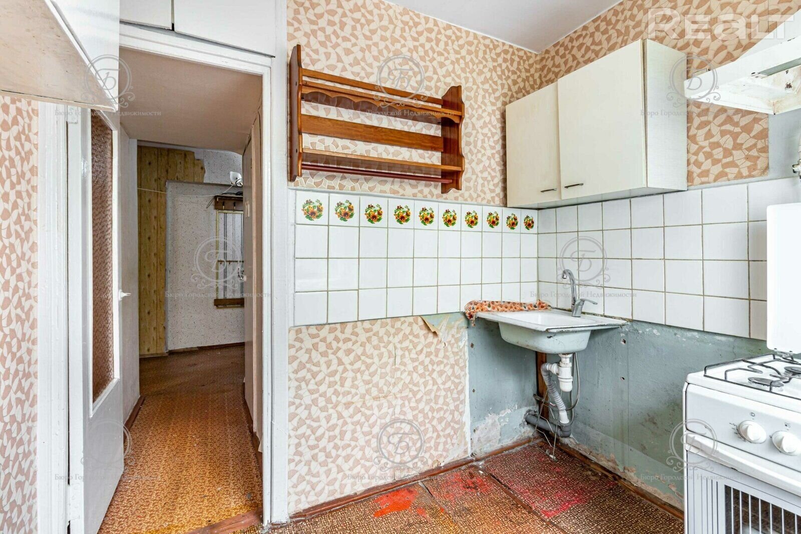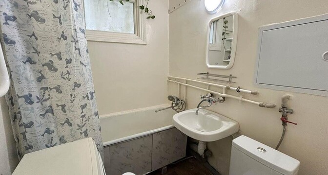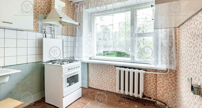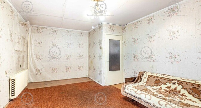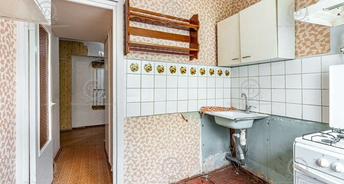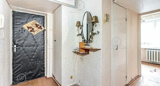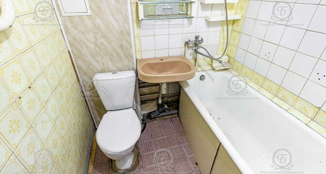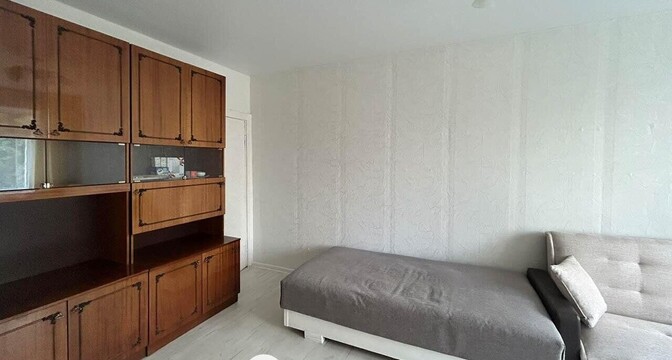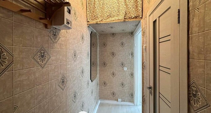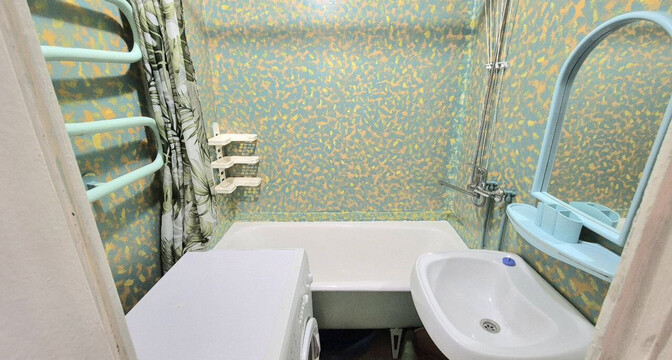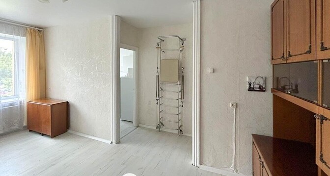 Ее площадь — 33,6 м², кухня занимает 7,15 м². Жилье нуждается в современном ремонте. Тут раздельный санузел, есть несколько ниш для хранения вещей. Балкон отсутствует.