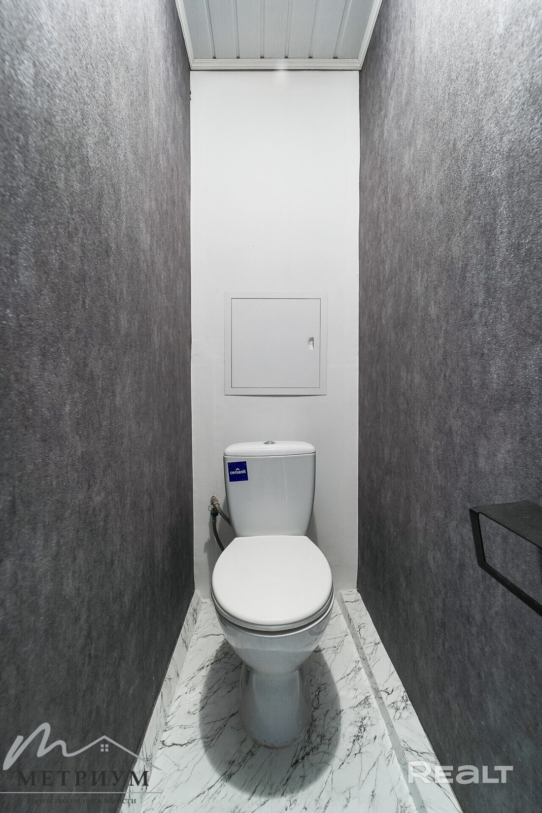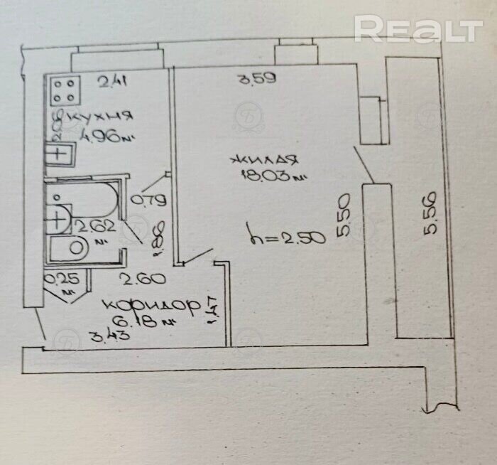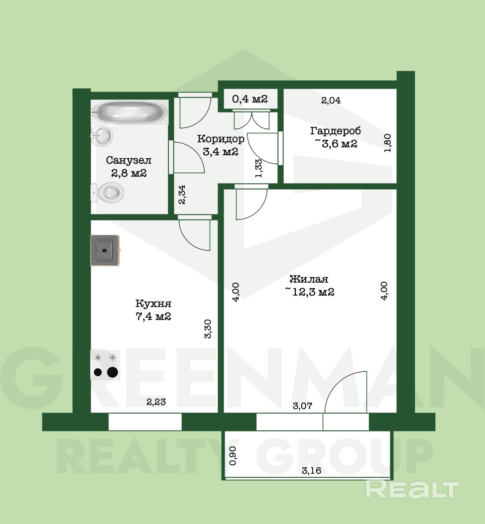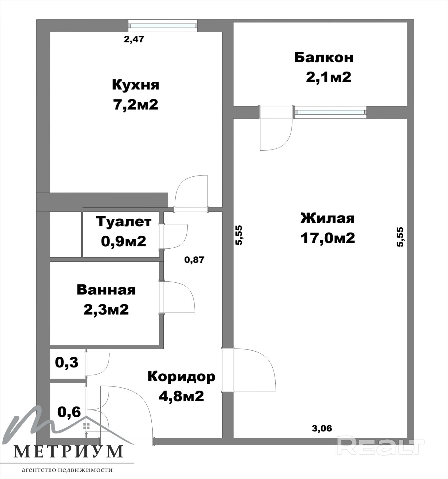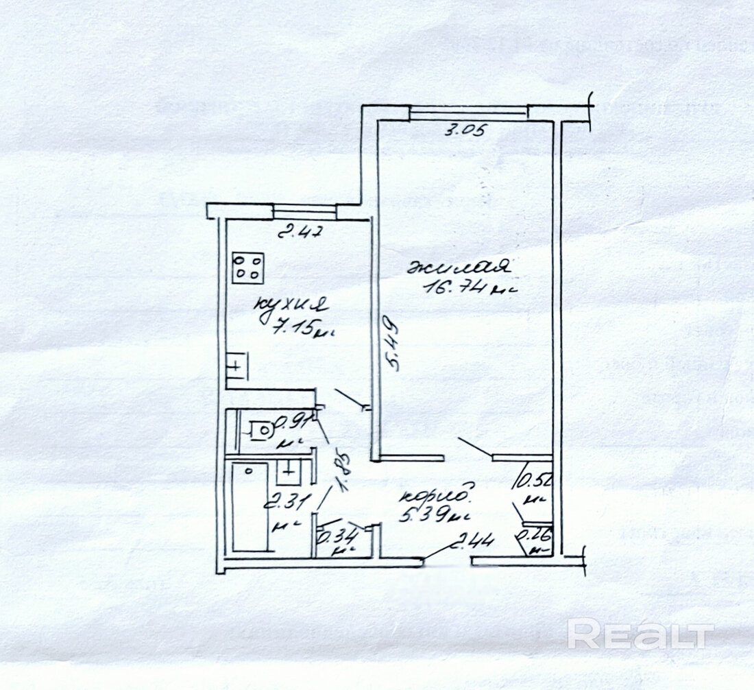 Ее площадь — 33,6 м², кухня занимает 7,15 м². Жилье нуждается в современном ремонте. Тут раздельный санузел, есть несколько ниш для хранения вещей. Балкон отсутствует.
