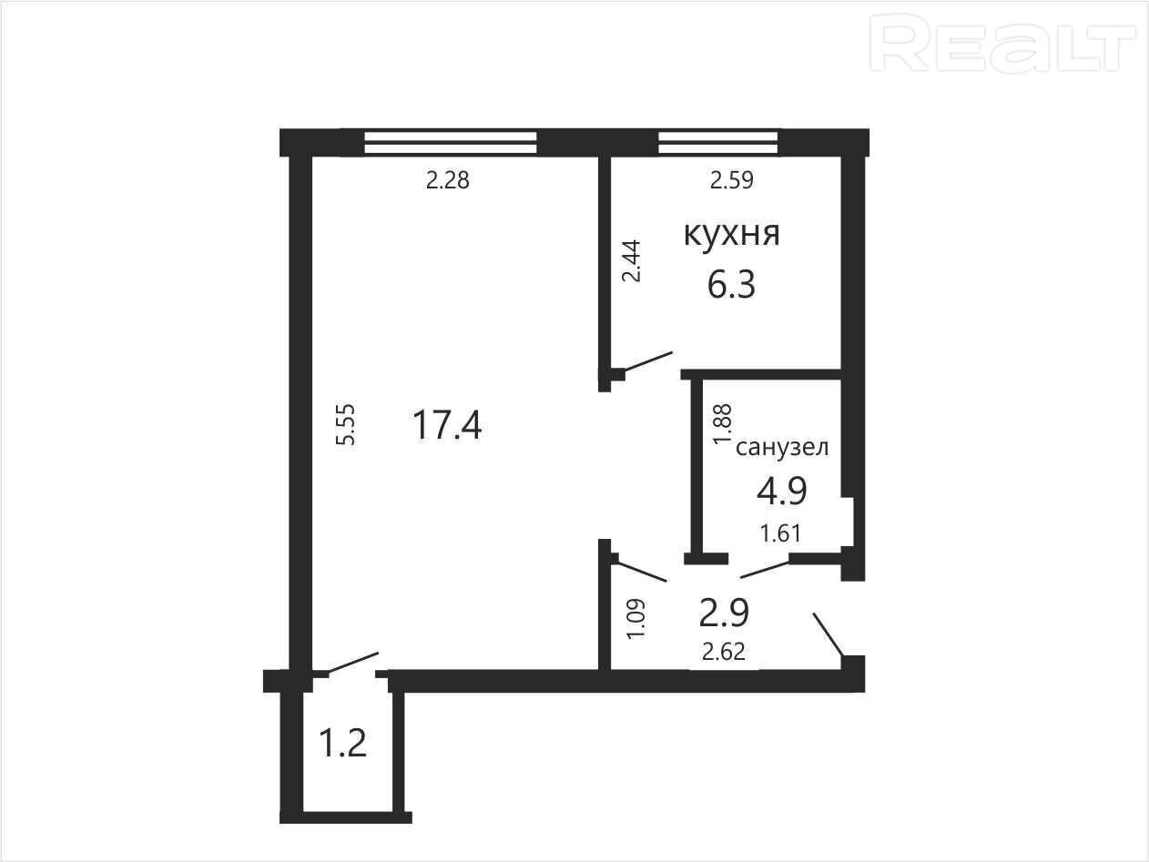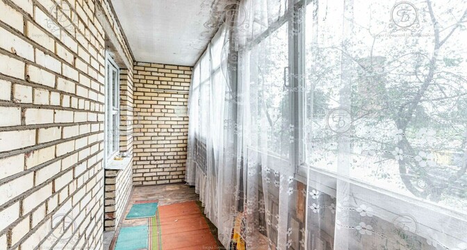 Площадь жилья — 32,04 м². На кухню приходится 4,96 м². Однушка идет под ремонт. Здесь балкон больше, чем кухня. Он занимает всю длину комнаты. Также покупателям достанется и подвал. Санузел — совмещенный.