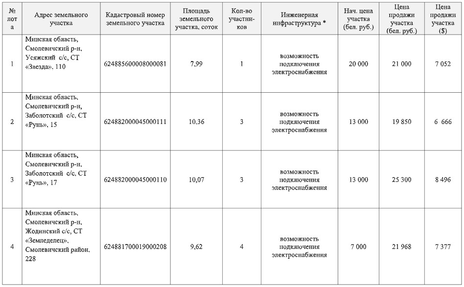 Торги прошли по 3 лотам. По 3 заявки подали на два участка в СТ «Рунь» Заболотского сельсовета. Их продали за суммы около 6,6 и 8,5 тысячи долларов.