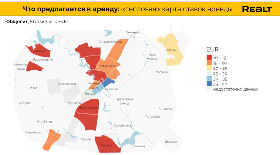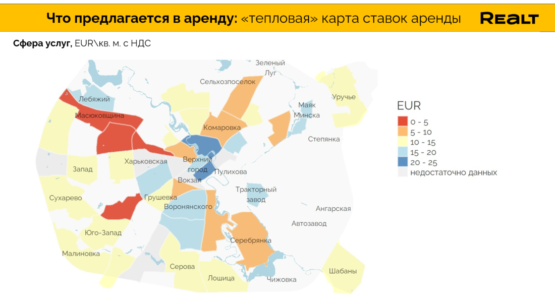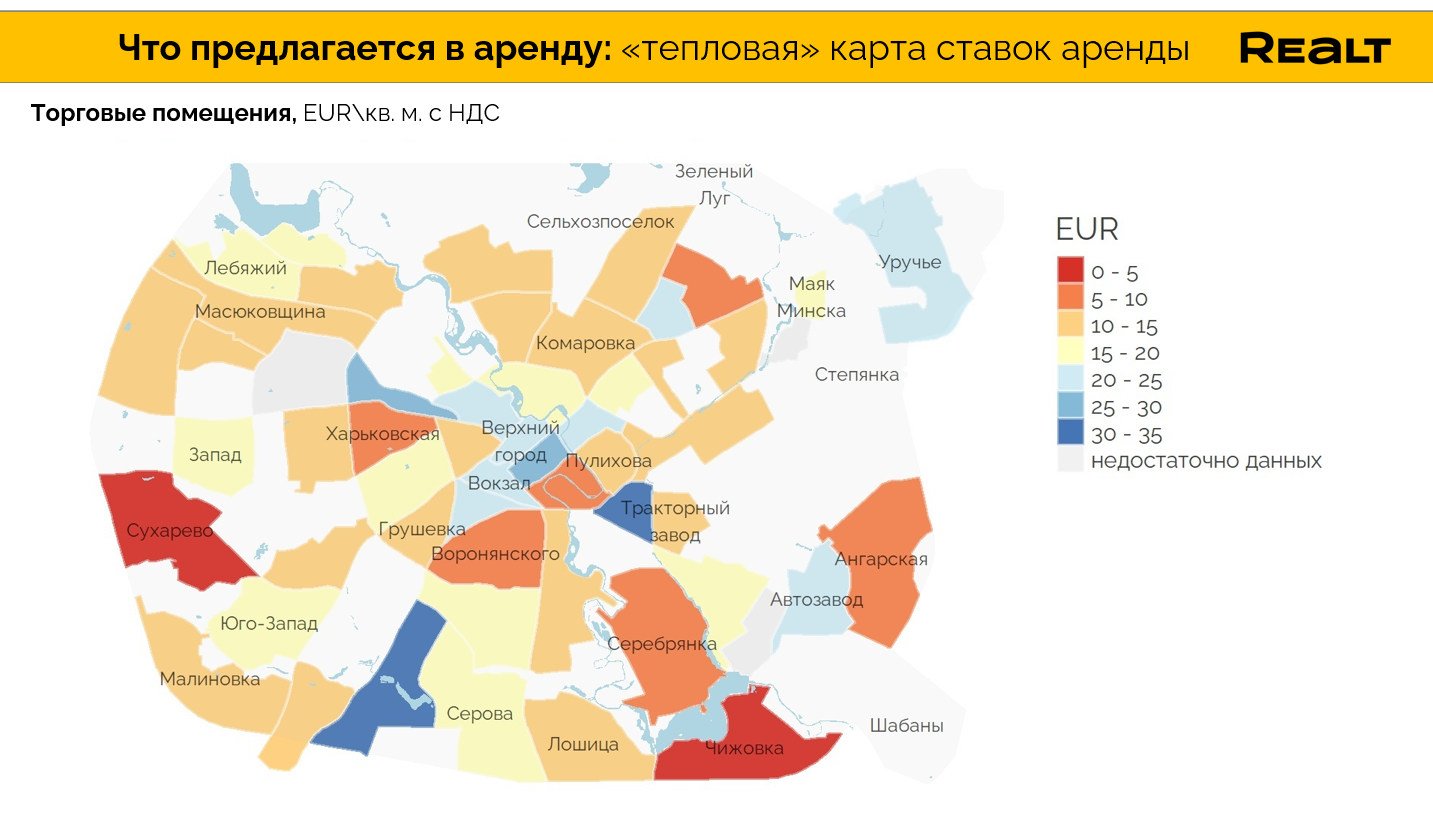 В то же время дорогие локации, где ставки могут достигать 30 EUR\кв. м., это не только центр города, но и например в окружении ст.м. «Тракторный завод» (за счет сформированной зон притяжения, большого трафика и количества встроенных помещений), или в наиболее проходимых локациях ул. Казинца.