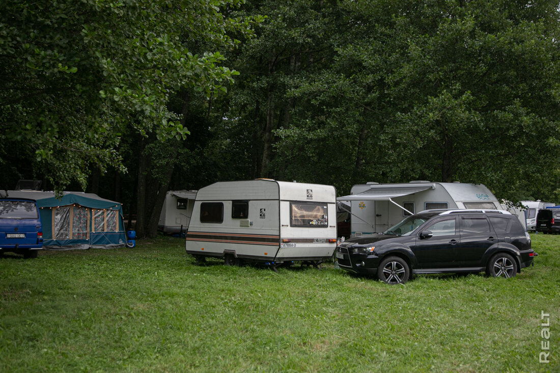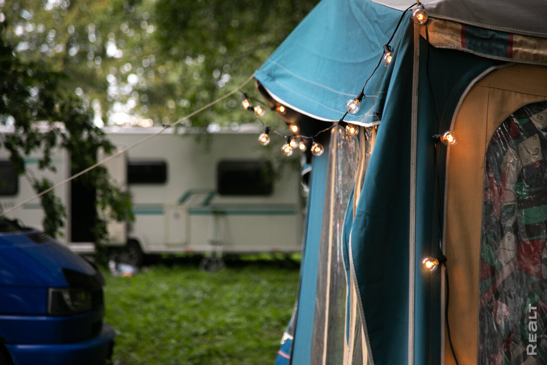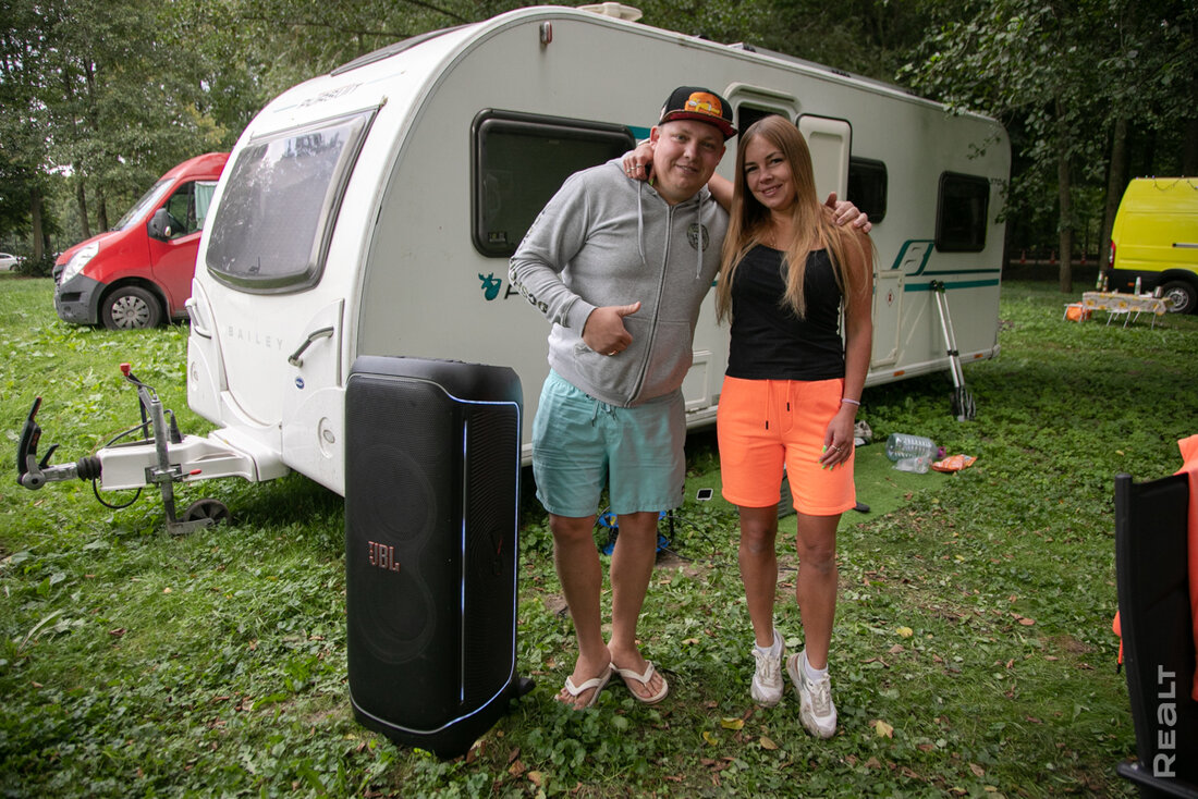 Финальная точка нашего путешествия по зонам проживания — автокэмп. Сюда пускают по билету «Аўтадом 3 днi». Нам сразу бросается в глаза яркая пара с огромной светящейся колонкой. Владислав и Екатерина приехали из Смоленска на собственном автодоме. «Без большого экрана и диджейского пульта, зато с хорошим настроением до утра», — улыбается Владислав.