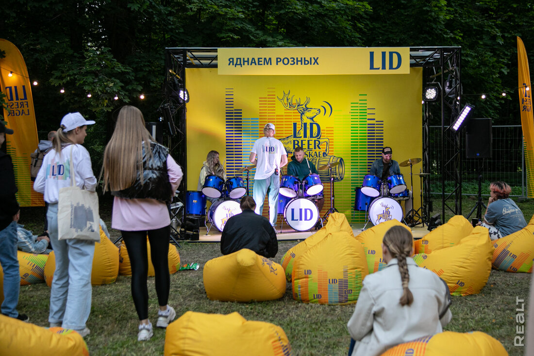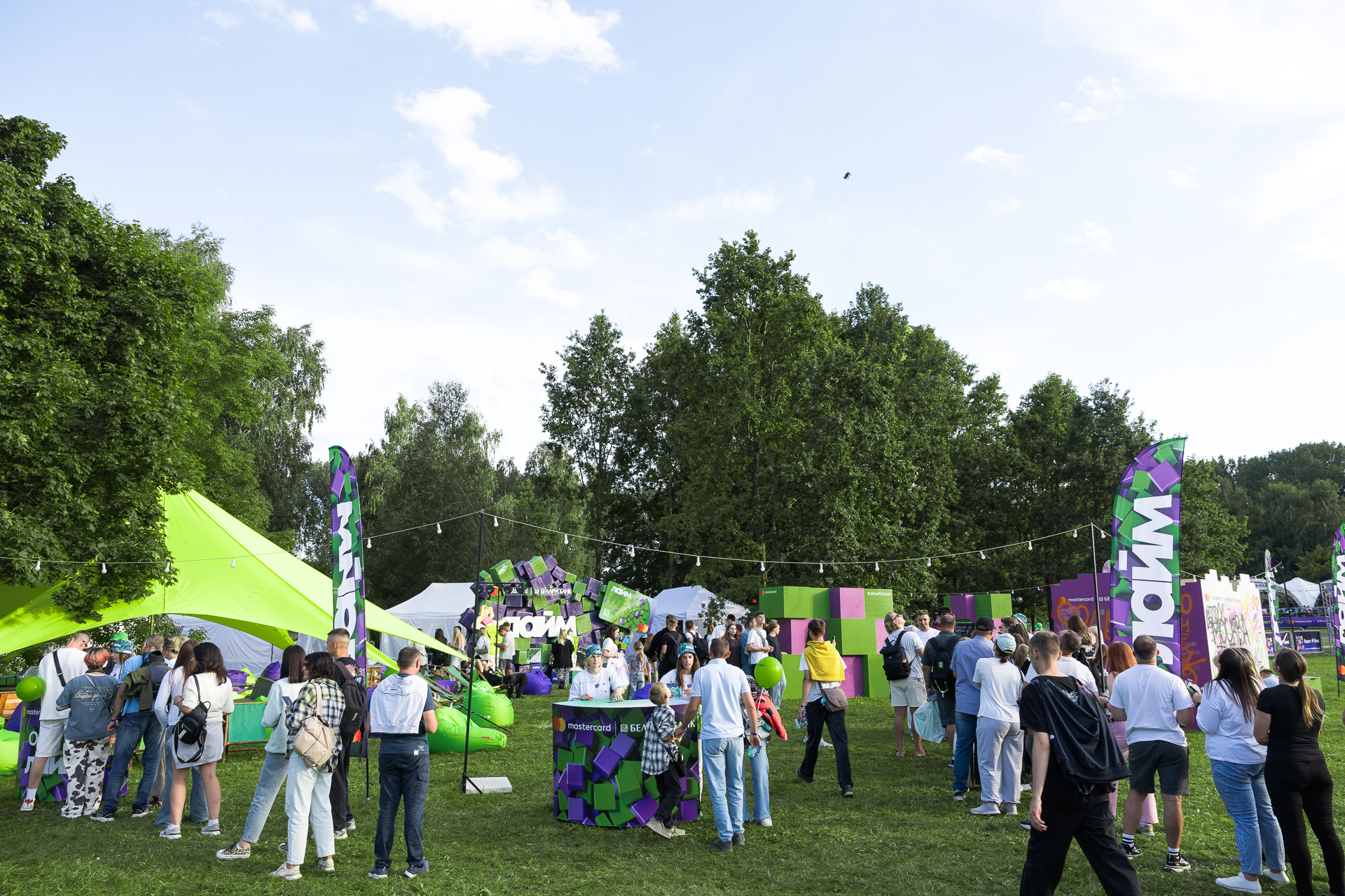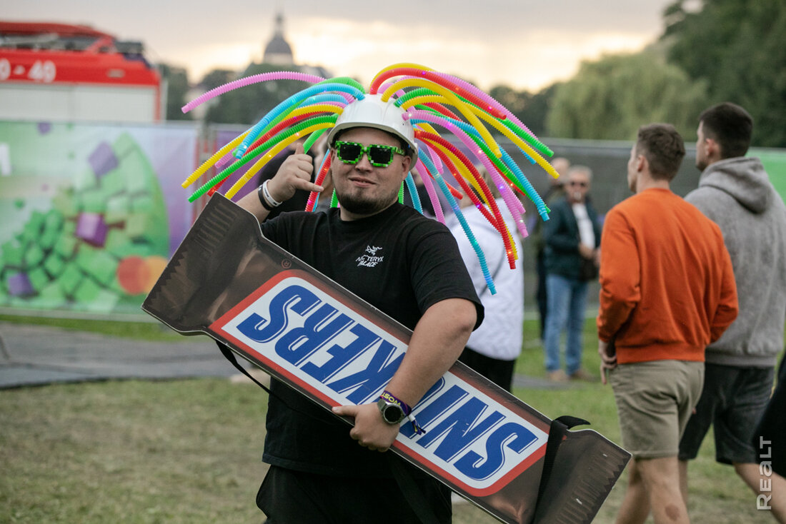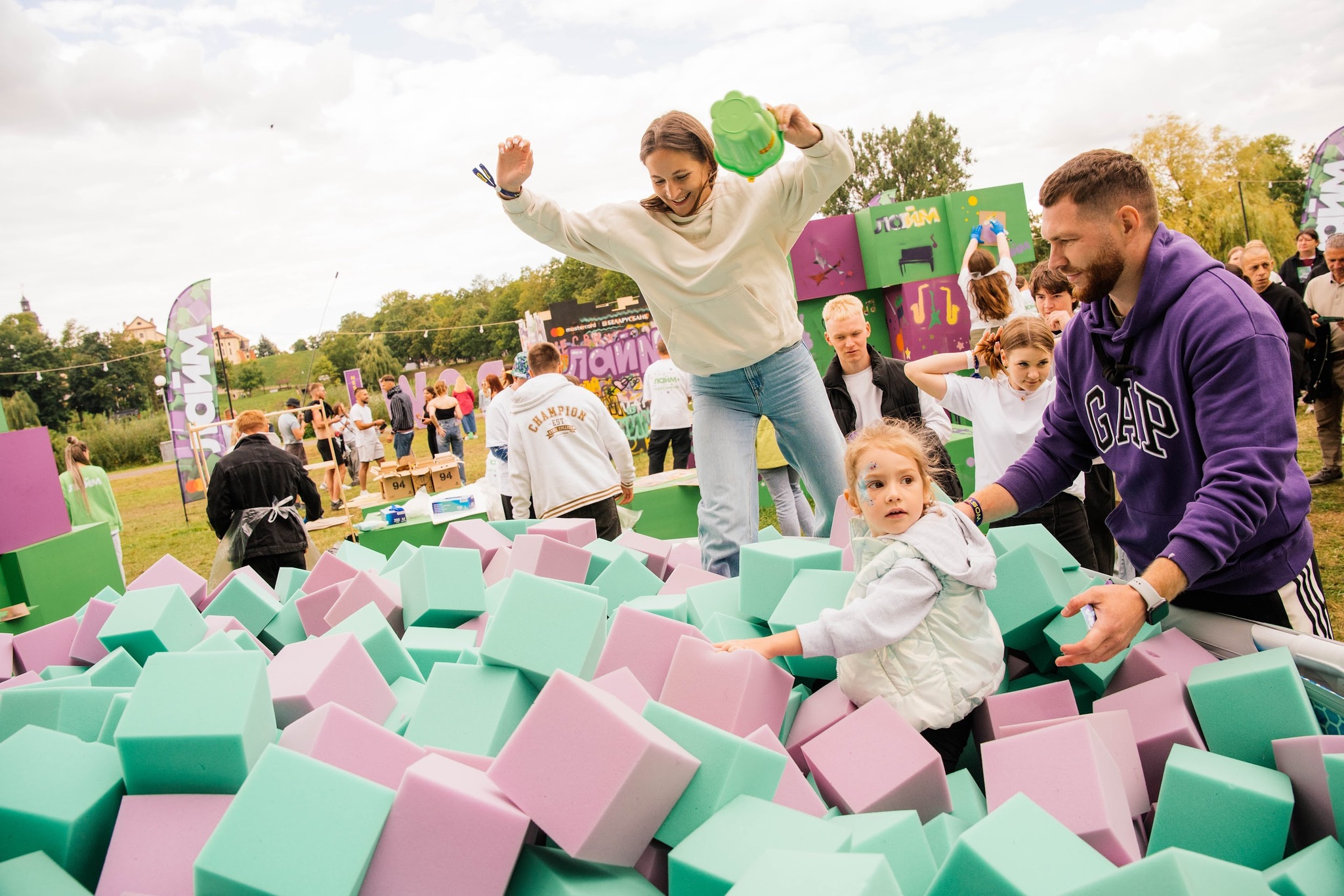 Масштабы зоны генерального партнера казались безграничными. В любой локации парка встречались ребят в ярких панамах и очках в ключевых цветах «Лайм». На самой зоне Беларусбанка можно было смастерить собственного воздушного змея и унести его домой. Но главной точкой притяжения для гостей стал огромный бассейн с кубиками: желающих прыгнуть в него было едва ли не больше, чем на первый ряд к сцене.