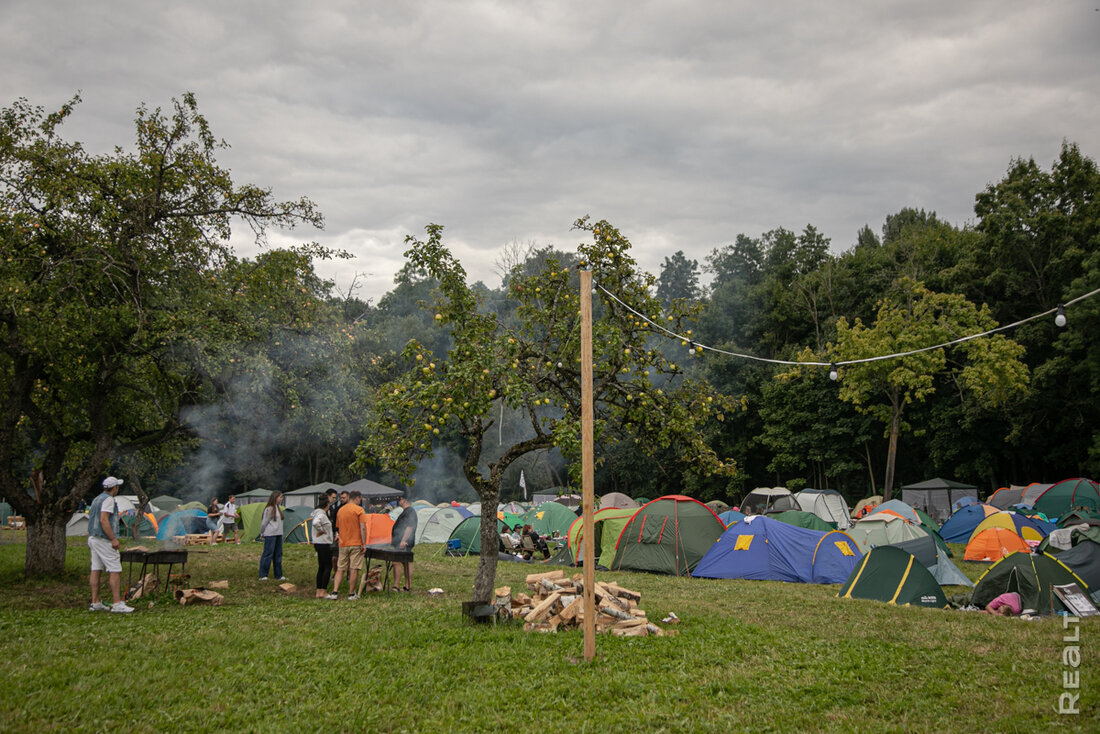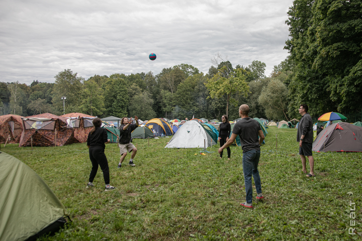 Потом нас ждали палатки, похожие на зелено-серые кубы из Minecraft. Живет в них интернациональная компания: ребята из Риги, Литвы и даже далекой Сибири. Раньше они ездили на Viva Braslav, а теперь второй год подряд выбирают Несвиж. Говорят, что влюбились в камерность, историческую атмосферу и возможность делать шашлыки в красивой локации. В лайнапе их фавориты — «Винтаж», «Корни» и Artik&Asti.