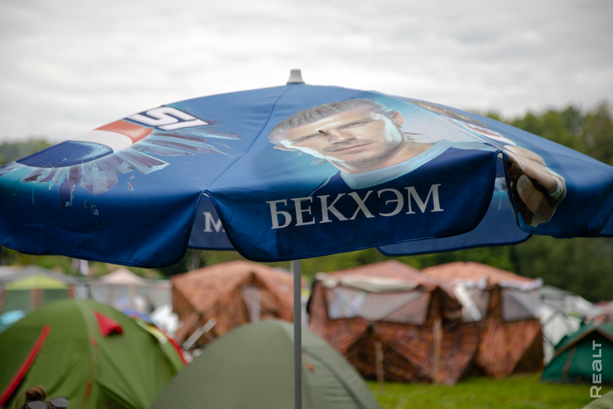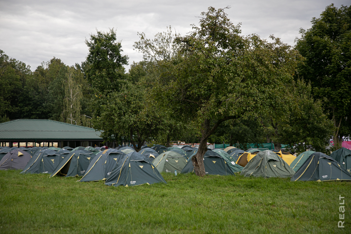 Чуть дальше — зона «бас-тура». Тут все выглядит максимально упорядоченно: одинаковые палатки уже стоят в ряд, и заселяться в них можно сразу по приезде. Живут здесь обладатели пакета «Зручны бас-тур 3 днi» категорий Premium и Premium+. У них по типу «все включено»: трансфер из Минска в обе стороны, билет на фестиваль и укомплектованная палатка. Приехал и сразу живи.