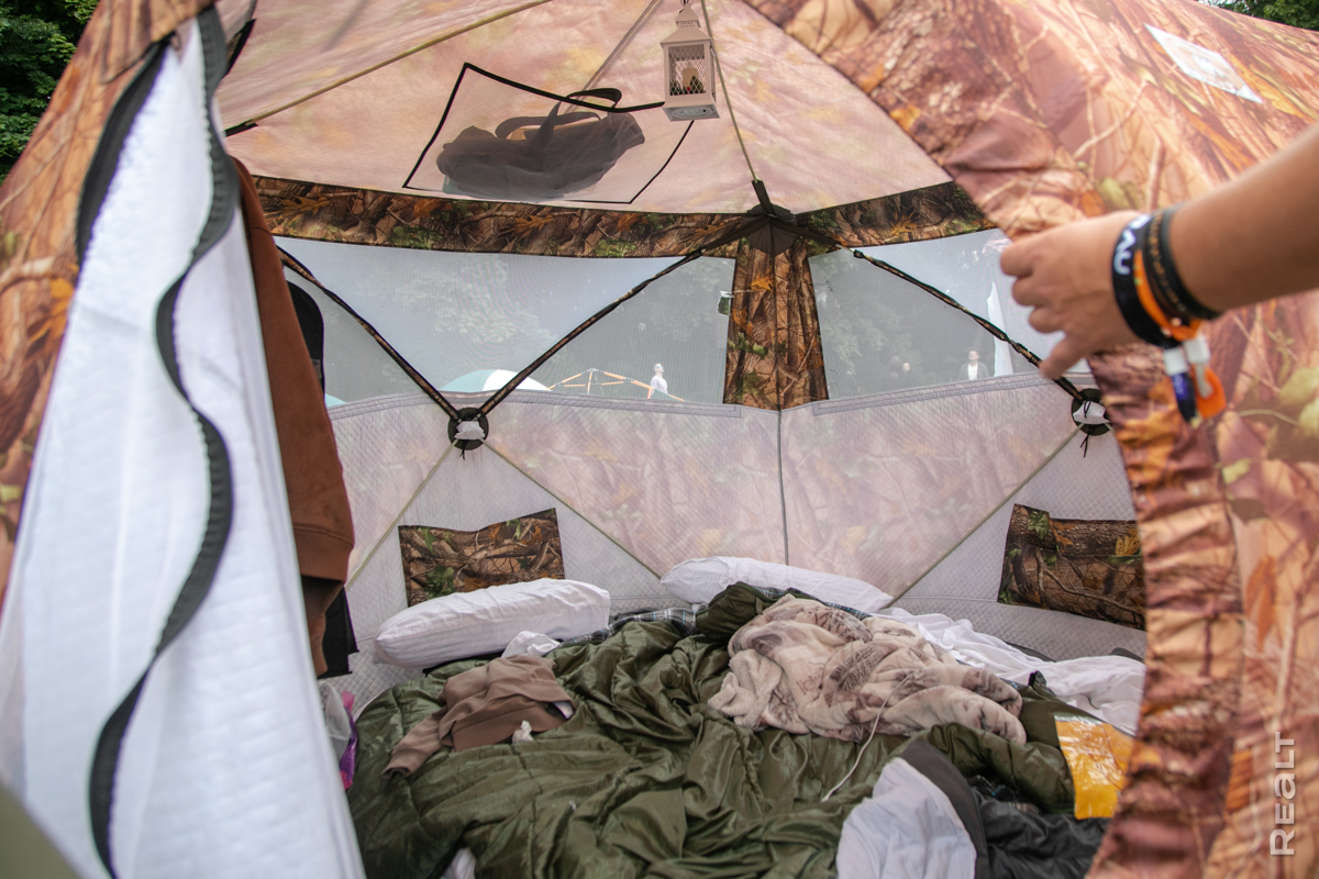 Внутри у них почти «мини-отель»: есть вешалка, ночник, а внизу аккуратно уложена пленка от влаги. «Мы прошли целую палаточную эволюцию: от первых маленьких палаток на Viva Braslav до профессиональных кубов в Несвиже», — смеются они. После концертов компания возвращается в свой лагерь, делится впечатлениями друг с другом без шумных посиделок и надевает беруши, чтобы спать спокойно, как младенцы.