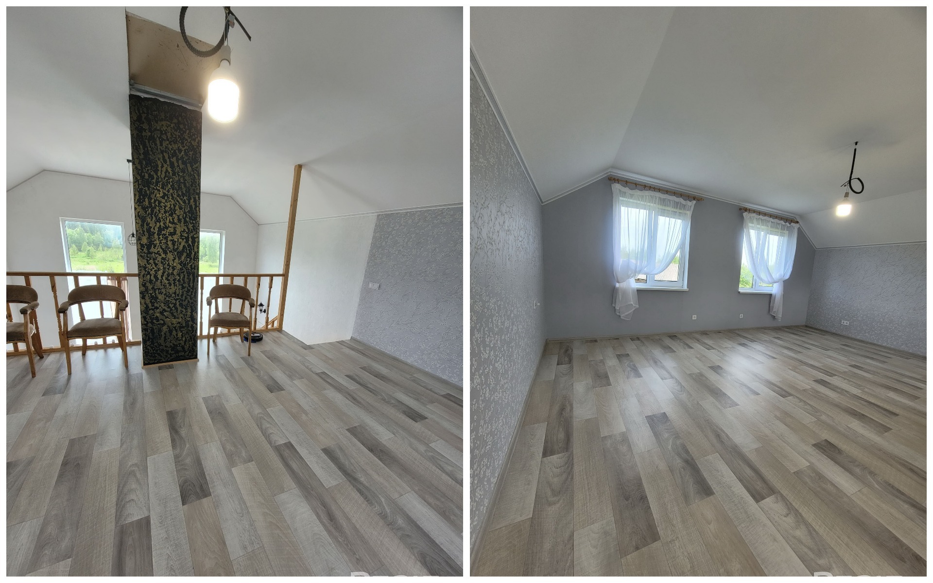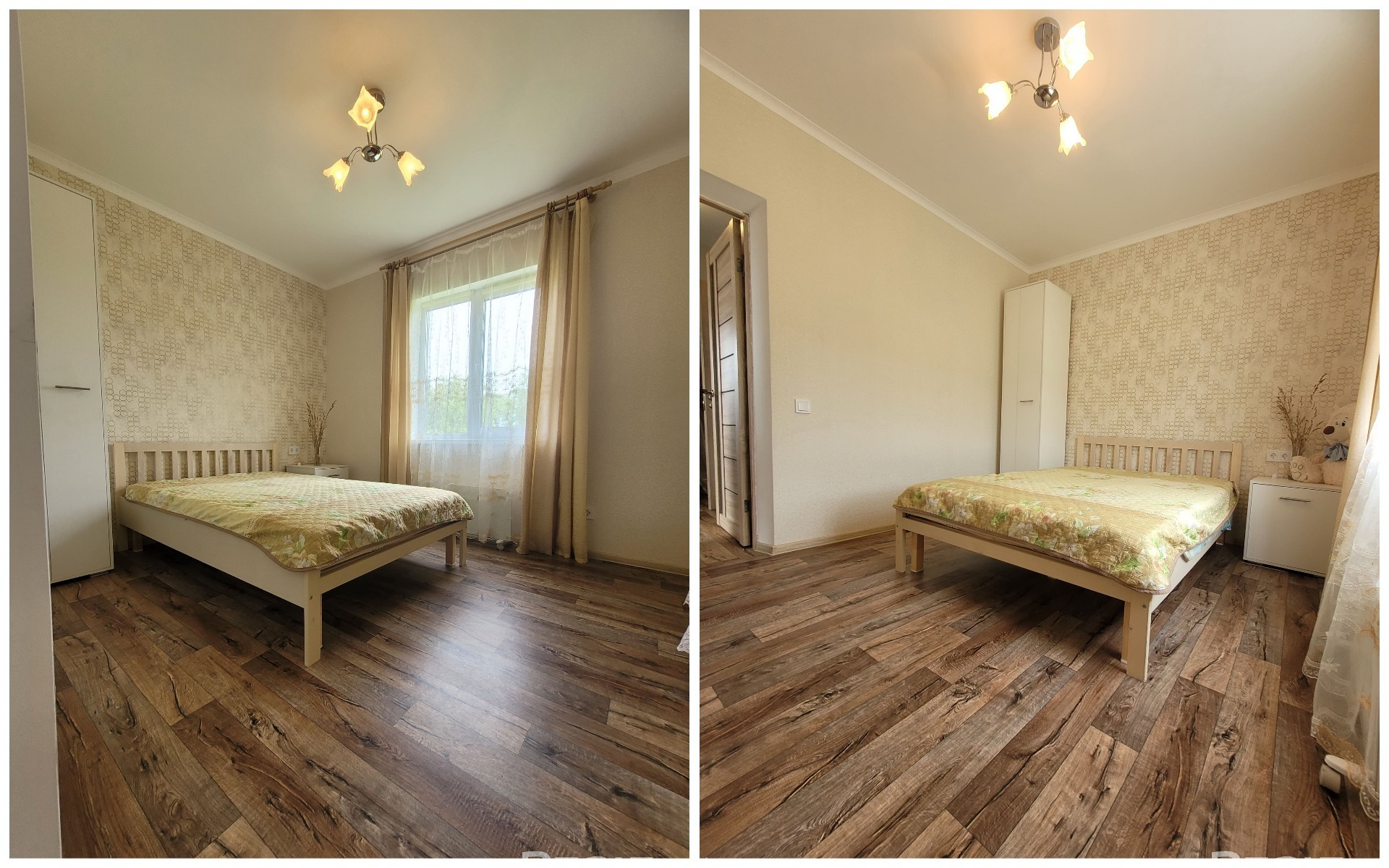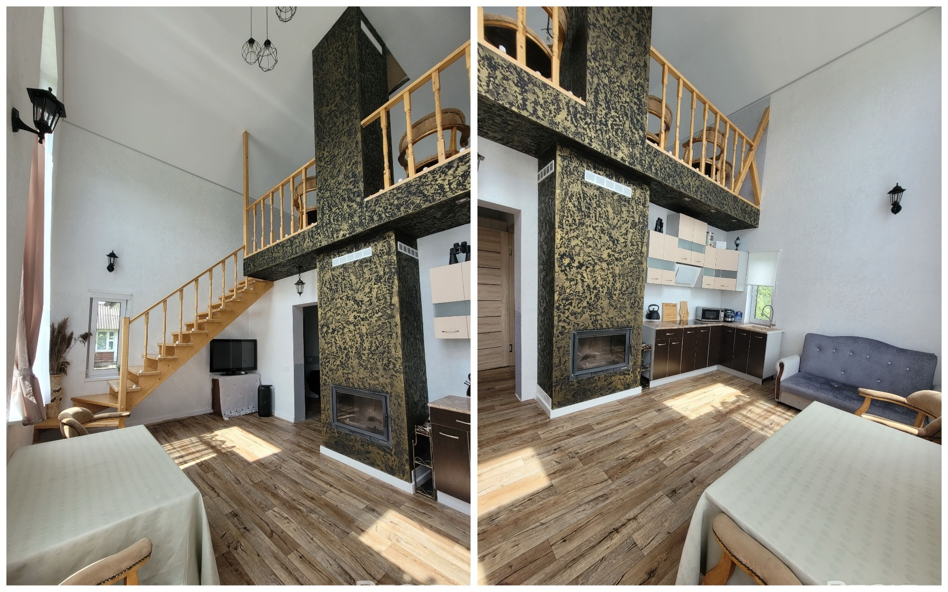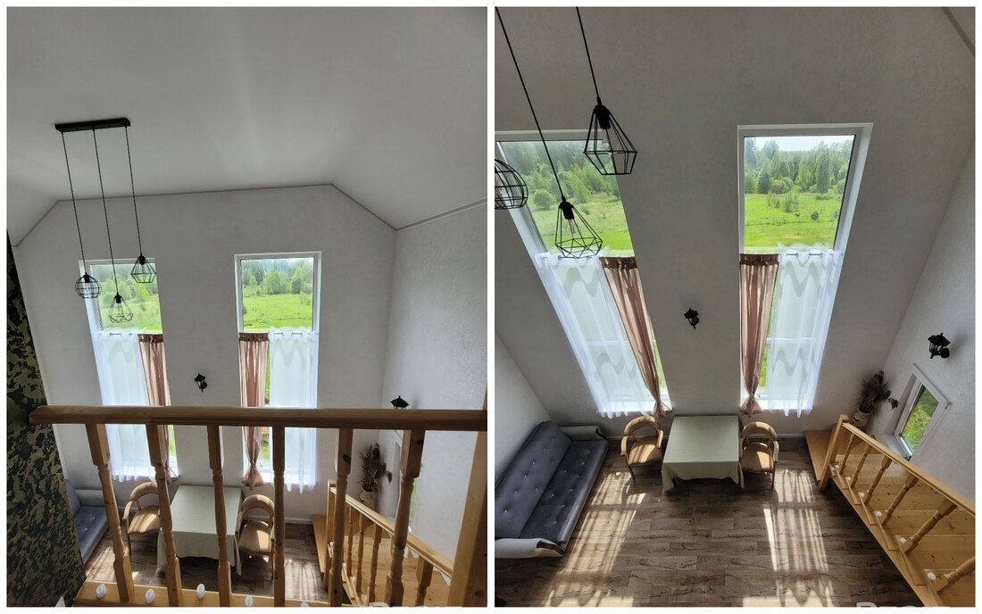 Также в доме оборудованы две спальни (одна на первом этаже, одна — на втором). Интерьер загородного дома выполнен в светлых тонах. Постройка уже обставлена мебелью и техникой.