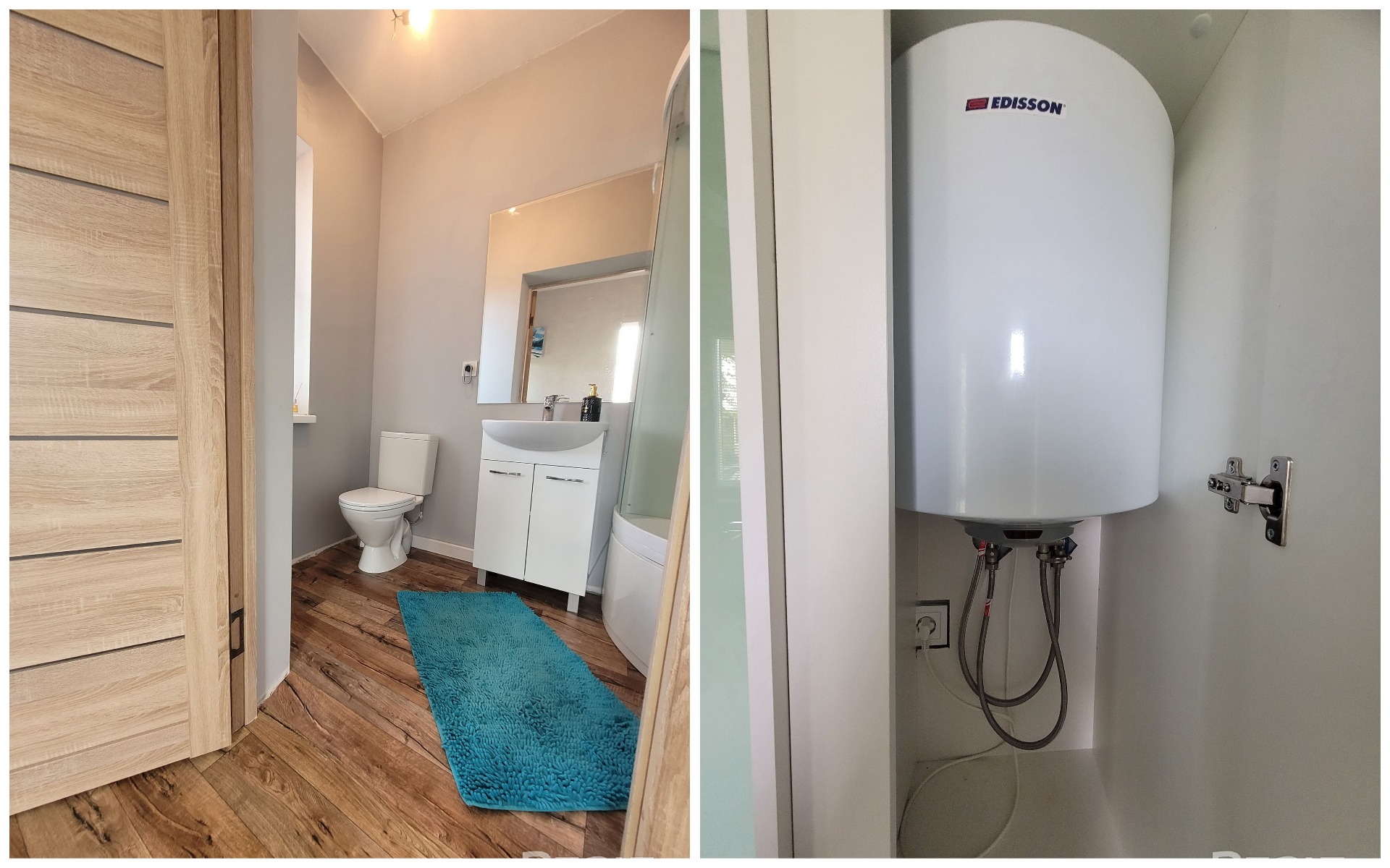 Все коммуникации заведены внутрь: отапливается дом электричеством (выведены силовые розетки по электробатареи), тут есть интернет, канализация (местная), вода (центральный водопровод). Санузел оборудован душевой кабиной и бойлером.