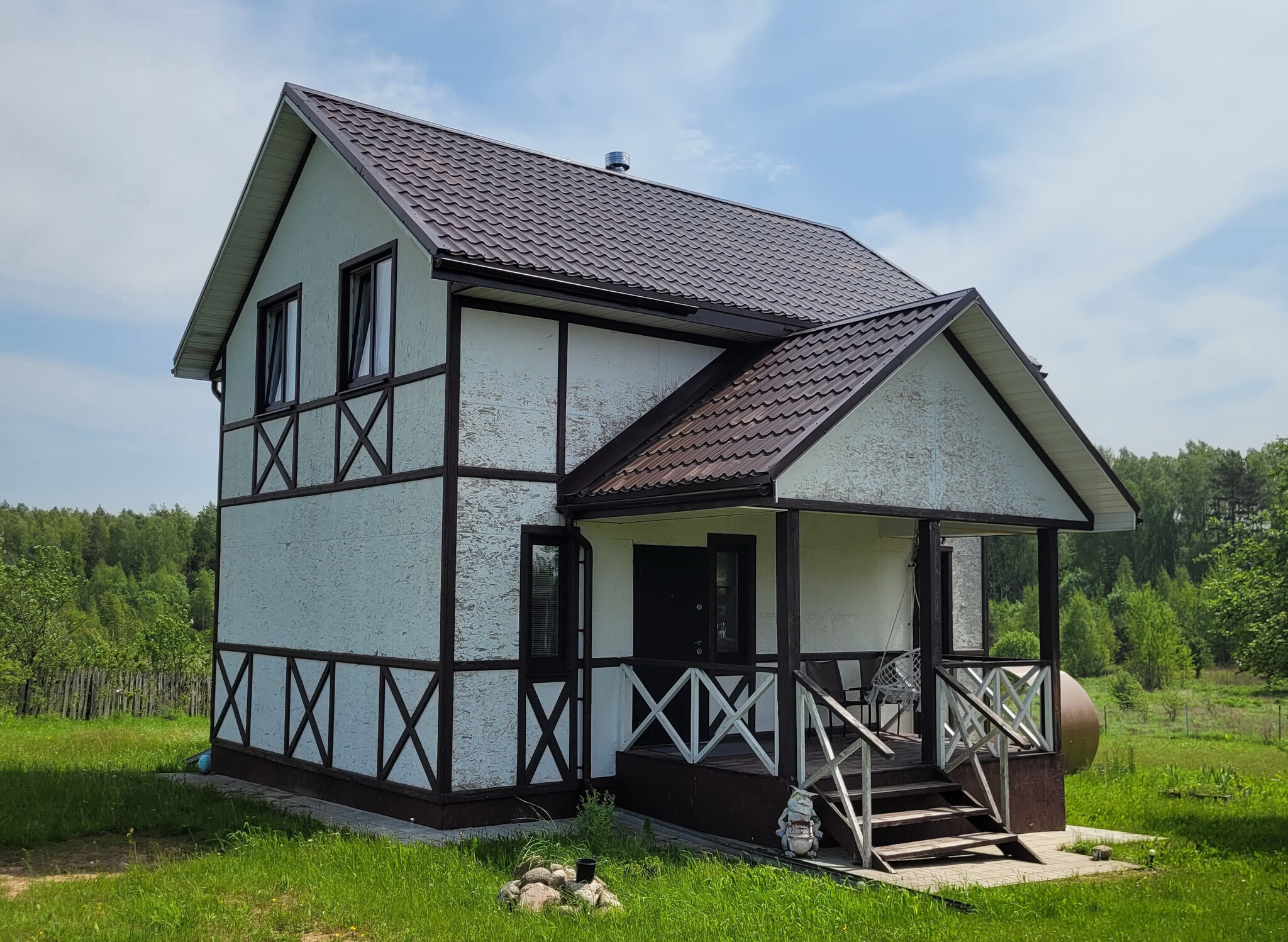 Дом с фасадом под фахверк построен в 2021 году по каркасной технологии с утеплением и соблюдением всех строительных норм. Стены снаружи — OSB плиты, внутри — влагостойкий гипсокартон, пол и потолок — насыпной утеплитель, крыша — металлочерепица.