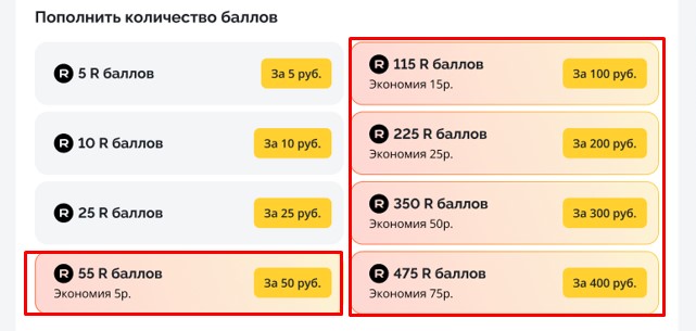 • За 50 рублей вы получаете 55 R баллов (5 R баллов бонусом);