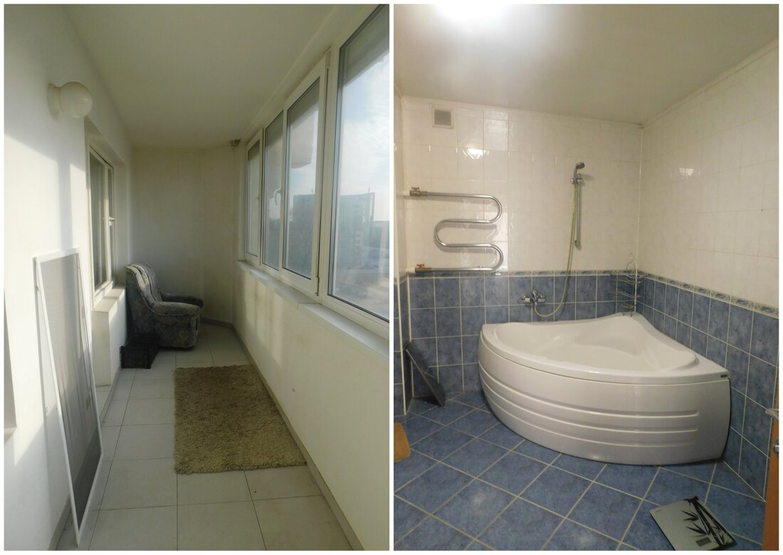Площадь квартиры этажом выше насчитывает 63 квадратных метра. Состояние ремонта в ней можно назвать удовлетворительным. Из особенностей можно выделить большой совместный санузел и просторную лоджию.