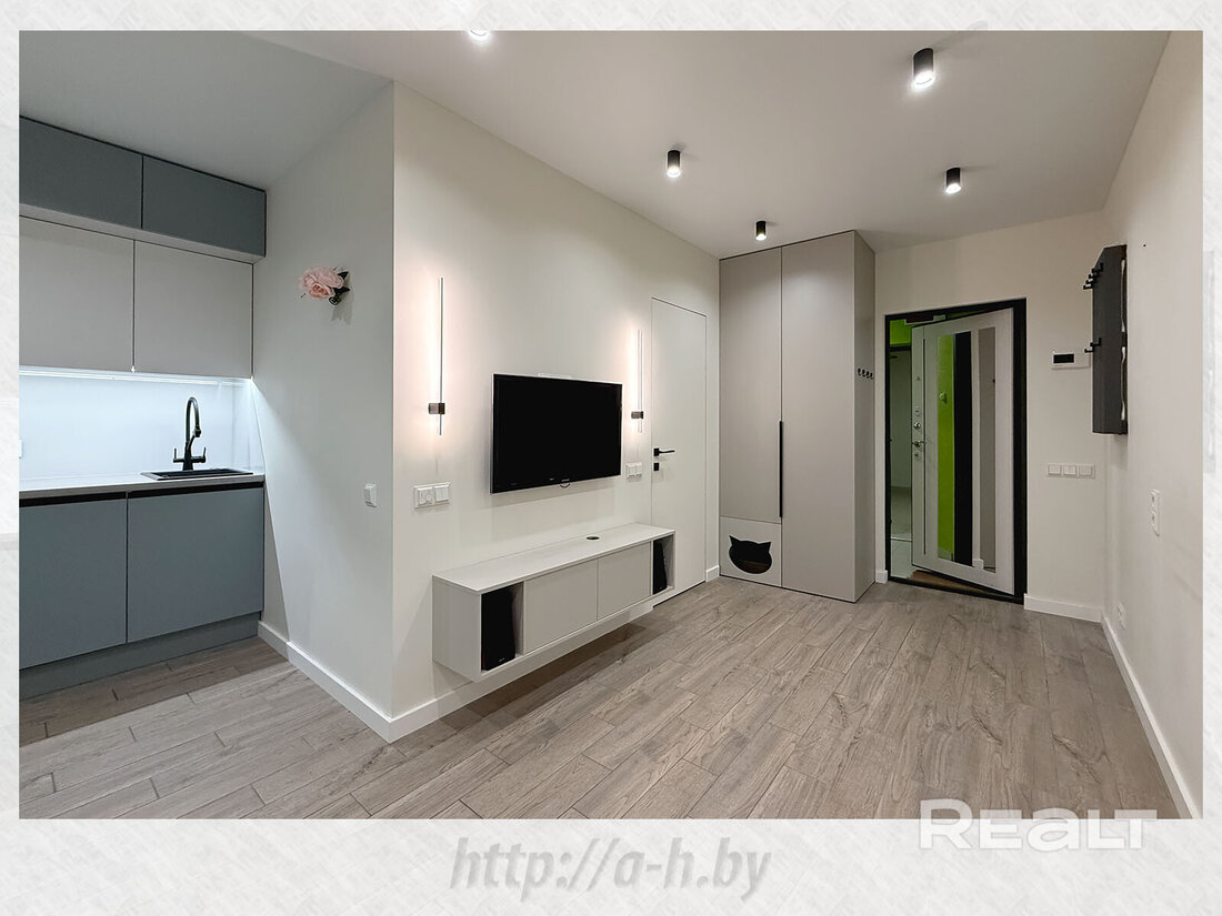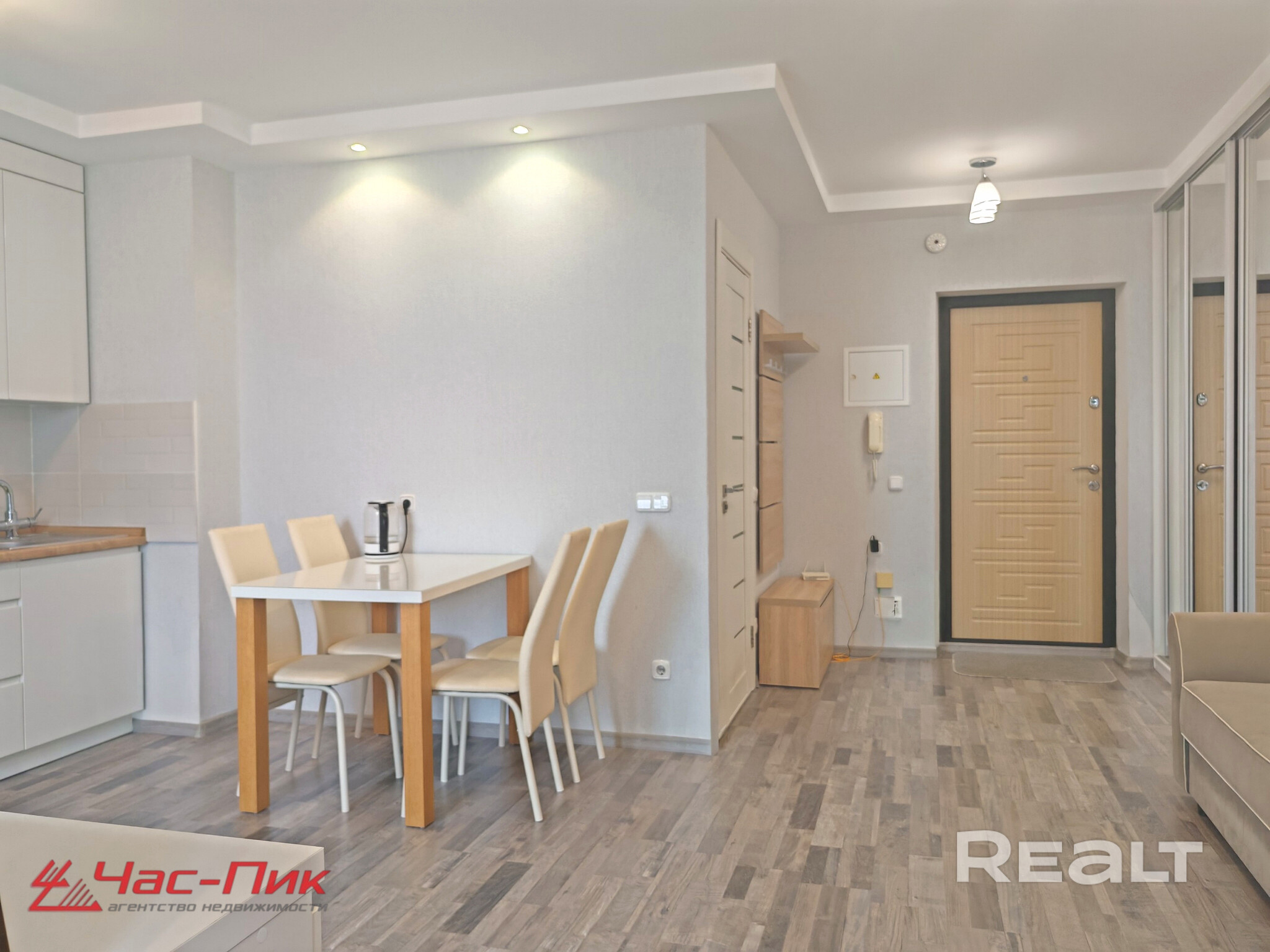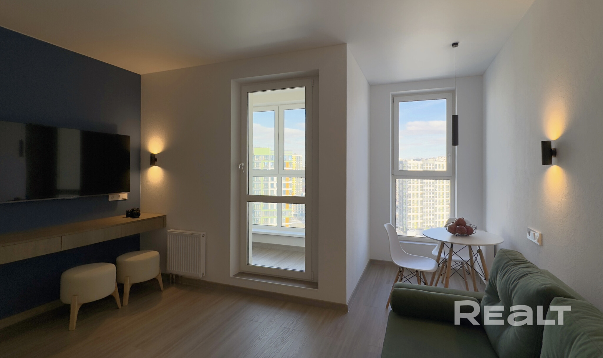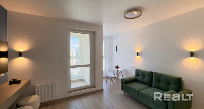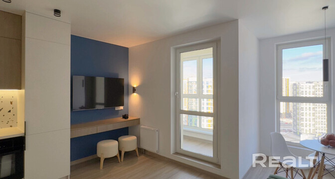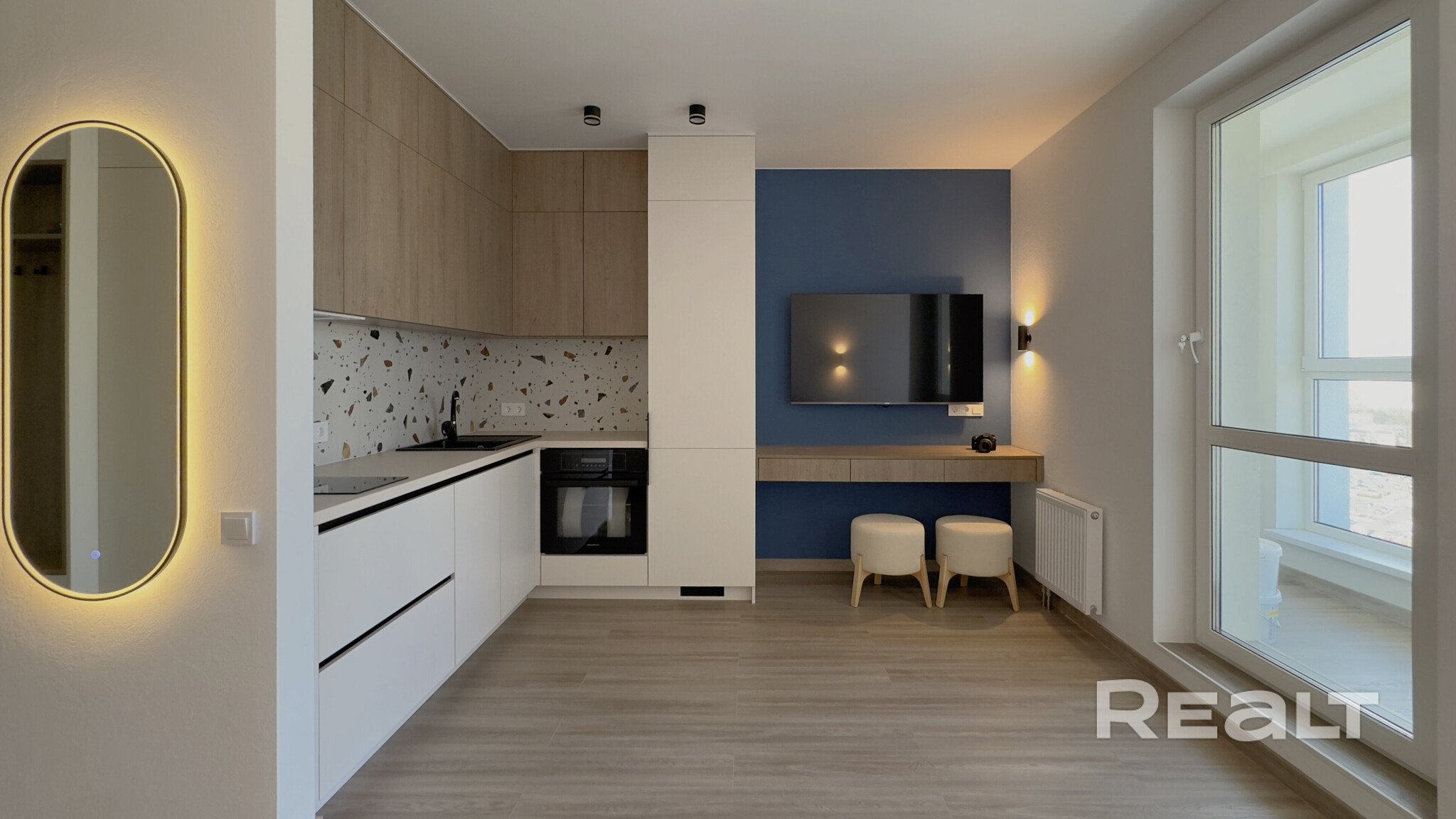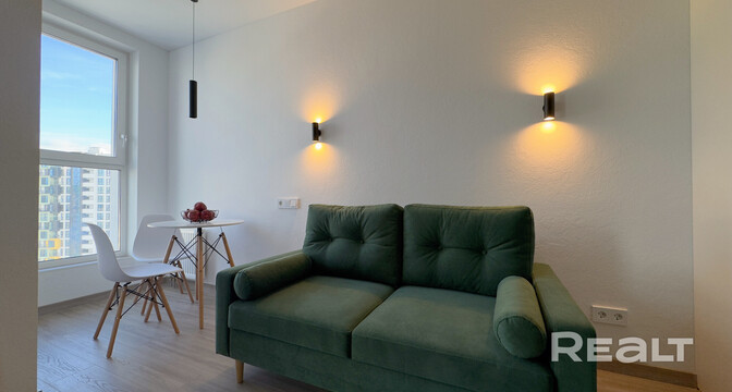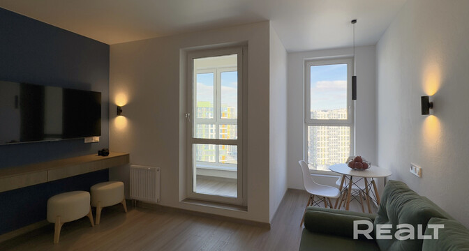 Последняя квартира в подборке находится в ЖК «Минск-Мир» в 25-этажном доме на Игоря Лученка, 8. Дом сдали в эксплуатацию в 2023 году. Студия располагается на 17-м и занимает 25,1 м². Около дома есть кафе и продуктовый магазин. За 10 минут на общественном транспорте можно добраться до центра города. В пешей доступности — станция метро «Аэродромная».