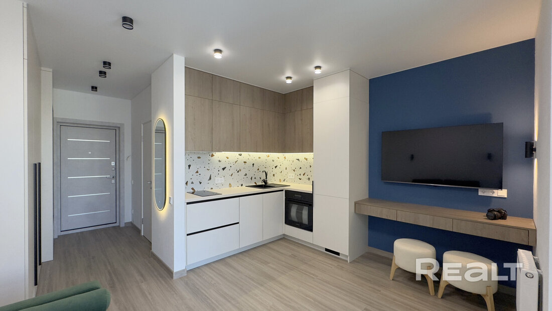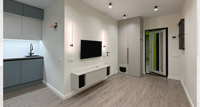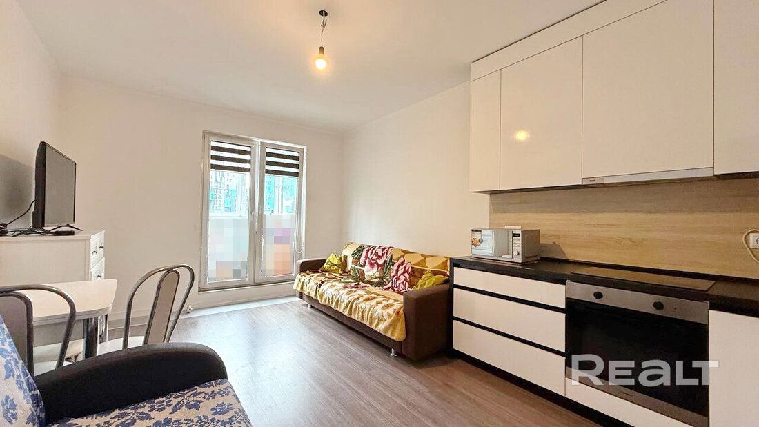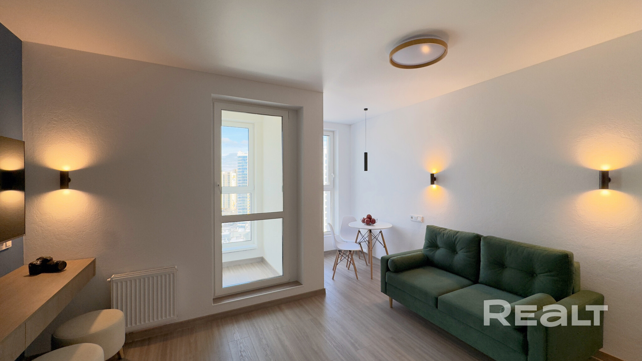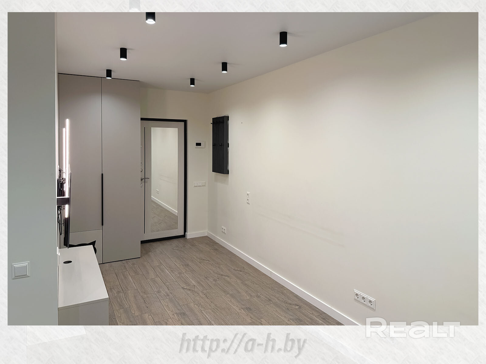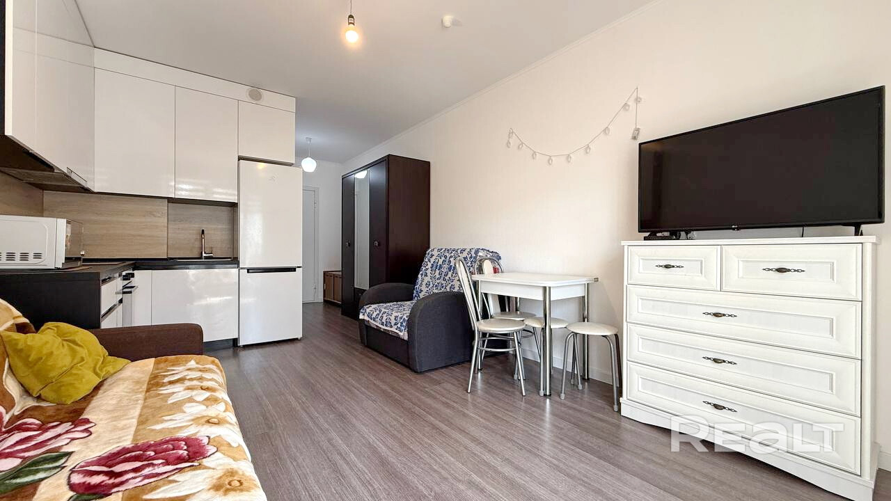 Последняя квартира в подборке находится в ЖК «Минск-Мир» в 25-этажном доме на Игоря Лученка, 8. Дом сдали в эксплуатацию в 2023 году. Студия располагается на 17-м и занимает 25,1 м². Около дома есть кафе и продуктовый магазин. За 10 минут на общественном транспорте можно добраться до центра города. В пешей доступности — станция метро «Аэродромная».