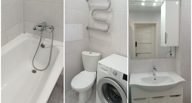 Жилье полностью готово к проживанию. Тут установлен кухонный гарнитур, имеется вся бытовая техника, включая кондиционер. Во всей квартире на полу уложена плитка с подогревом. Санузел — совмещенный. Студия идет с застекленной в пол лоджией. Везде установлены пластиковые стеклопакеты.