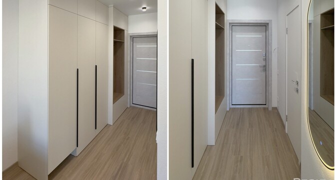 В квартире сделан ремонт. Рядом с зоной кухни имеется выход на застекленную лоджию. На полу лежат ламинат и плитка. В коридоре стоит шкаф-купе. Кухня полностью укомплектована встроенной мебелью и техникой. Санузел здесь совмещенный.